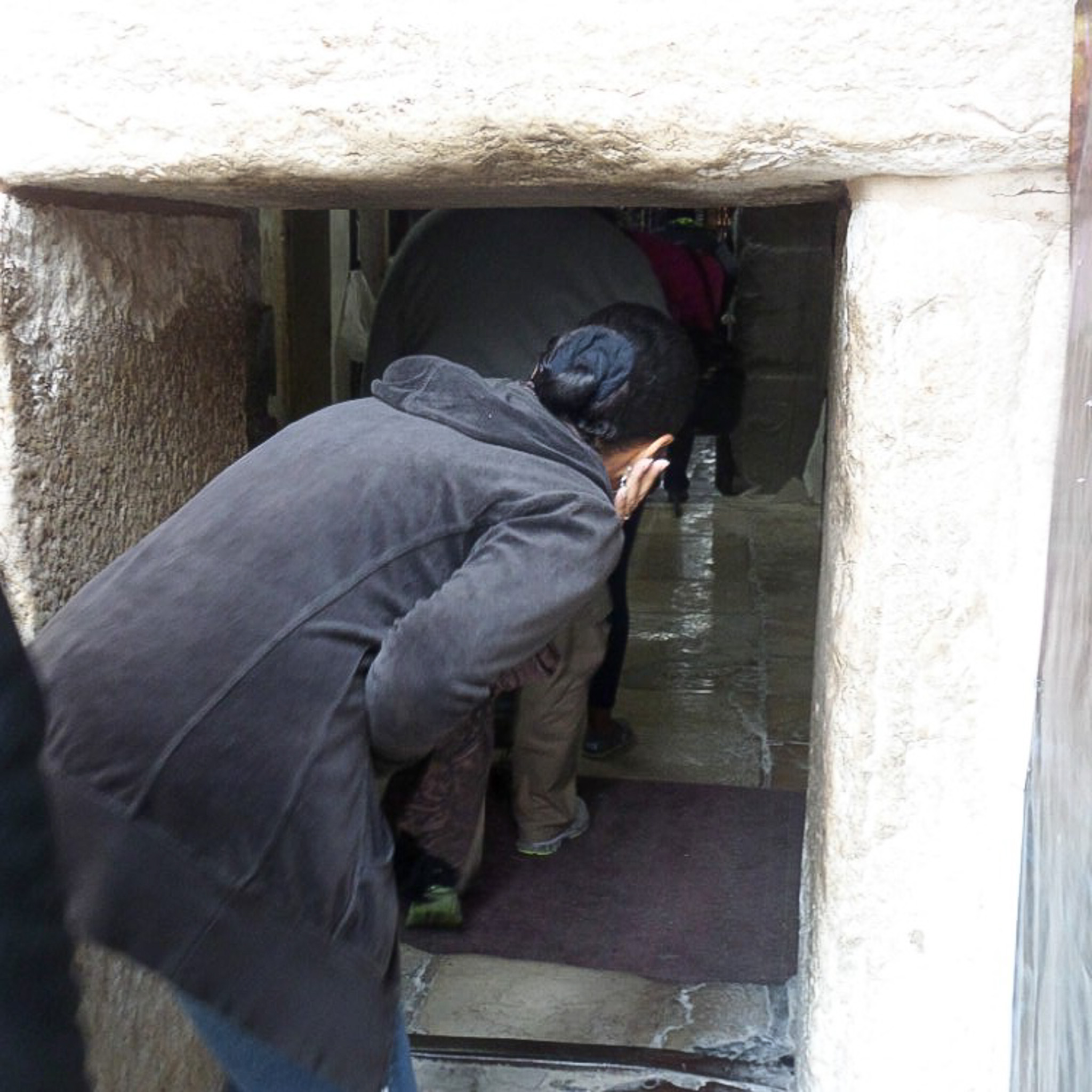 The entry to the Church of the nativity represents three eras. The Justinian era entry and the Crusader version of the door are above the area in this photo. This tiny door, called the Door of Humility, was added by the Ottomans.
