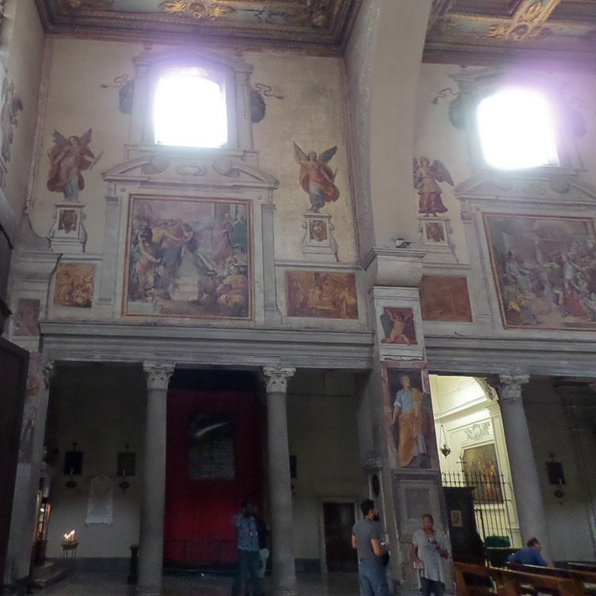 The Basilica of Saint Praxedes (in Italian: Basilica di Santa Prassede, commonly known as Santa Prassede) is a Catholic basilica located in the Rione Esquilino (or district of Esquiline). Esquiline is the name of a Roman hill, one of seven on which the ancient city was built. The church was rebuilt by Pope Pasquale I in 822 CE and was restored multiple times since then. It was built principally as a resting place for the relics of Roman martyrs and was dedicated to the second-century Saint Praxedes, who was the daughter of a Roman senator. Along with her sister, Praxedes provided comfort and care to Christians persecuted in the Roman Empire. The sisters were murdered for burying early Christian martyrs, which defied Roman law. The church is known for being the most important example of early Christian Byzantine art in Rome because of the mosaics decorating its apse and side chapels. The photograph shows the central nave (of three), with large granite Corinthian columns on a mosaic floor. Four of the sixteen original columns, which directly support the entablature, were later incorporated into reinforcement pillars which support three large transverse arches decorated with 17th century frescoes featuring the Apostles and the Passion of Christ. One of these transverse arches is shown in the photograph. Note the three dimensionality of the frescoes, as shown right of center in the photograph; the figure seems to be stepping out of the column, a perspective which is characteristic of High Italian Renaissance paintings.