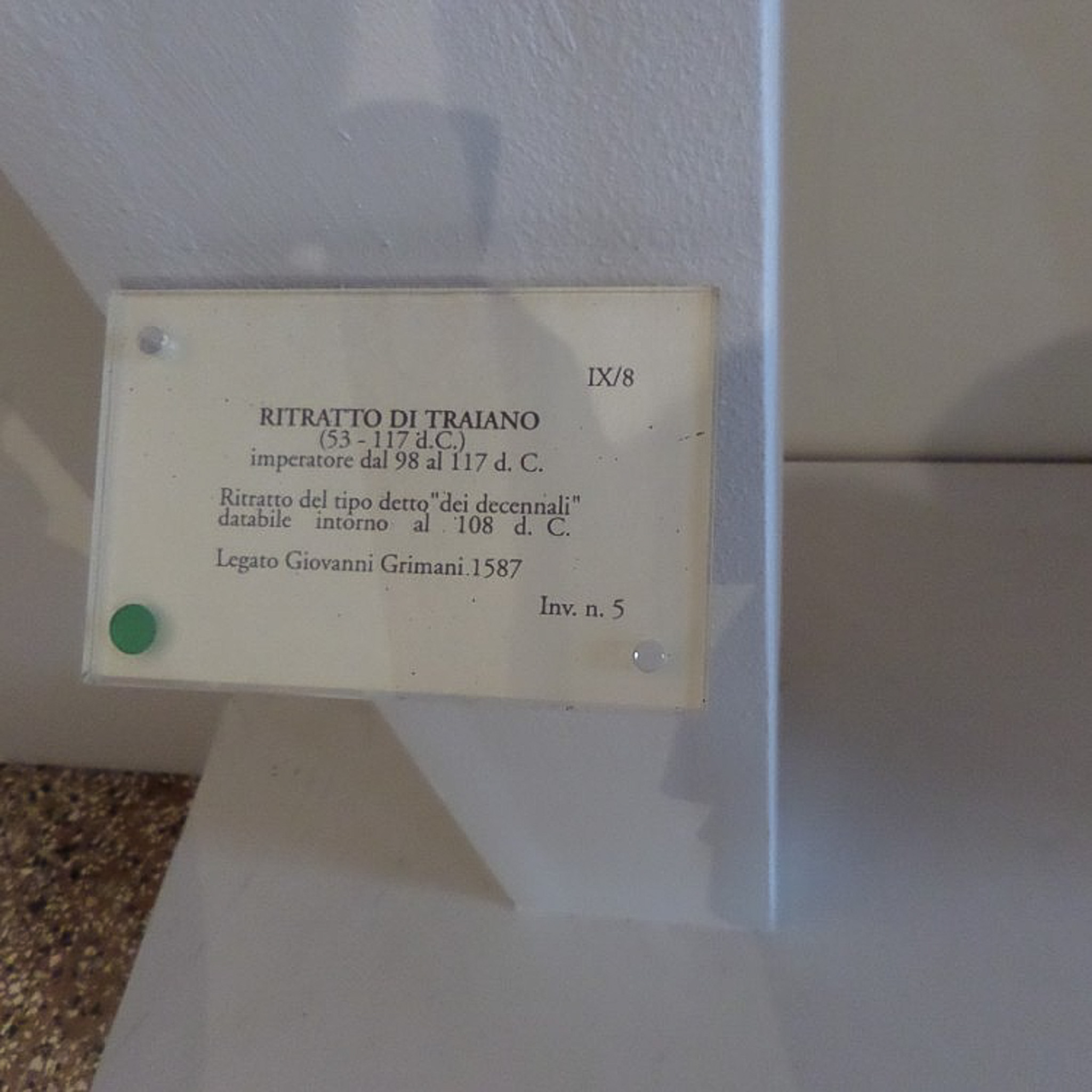 Multiple photos are associated with this record. Please click the links to view all of the items in the series. The photos were taken in the Royal Palace of Venice (in Italian: Il Palazzo Reale) in the San Marco district on the island of Venice, Italy. Venice (Venezia) is a city in northeastern Italy that is built on a group of 126 islands separated by open water and canals, linked through 472 bridges. The historical island city is home to only 51K people, but a very popular tourist destination with about 60K tourists per day. A UNESCO World Heritage Site, it is renowned for its beauty, architecture, and artwork. The landmark of St. Mark's Square (Piazza di San Marco) is the basilica dedicated to Saint Mark the Evangelist and contains his relics. The church is sited on the eastern end of the square, the former center of the Republic of Venice, and is attached to the Doge's Palace. There are other important landmarks around this square, such as the Royal Palace of Venice, which is a complex that consists of the Marciana Library, the Archaeological Museum, and the Correr Museum (Museo Correr). The Correr Museum's items originated with Teodoro Correr, a passionate collector who bequeathed his collection to the city of Venice in 1830. The photos show signage and a bust of Trajan, the Roman emperor from 98 to 117 CE. Trajan was a philanthropic ruler and is remembered in history as one of the Five Good Emperors of the Nerva Antonine dynasty. The portrait of Trajan is the called the "decennial" type, dating back to around 108 CE.