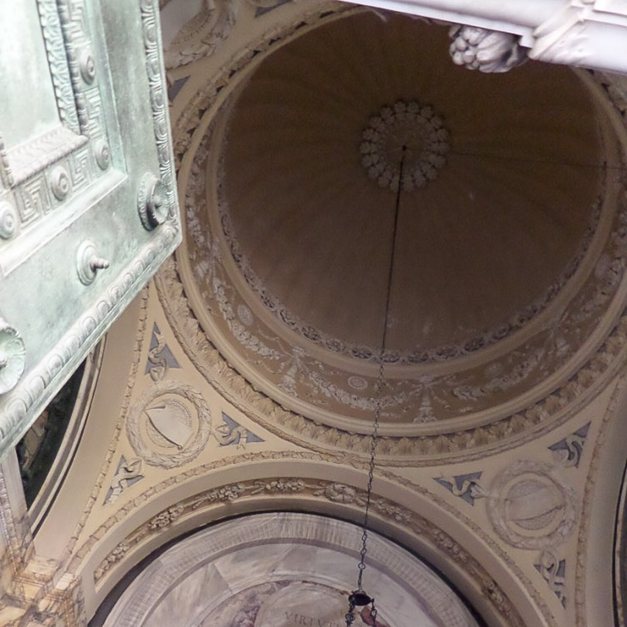 This image shares the a look at the domed roof of the Tomb of Dante. It is in neoclassical styles with floral swags decorating the rim. The structure was commissioned in 1780 by Cardinal legate Luigi Valenti Gonzaga and the architect was Camillo Morigia. The external view of this tomb gave rise to its nickname, "The sugar bowl".