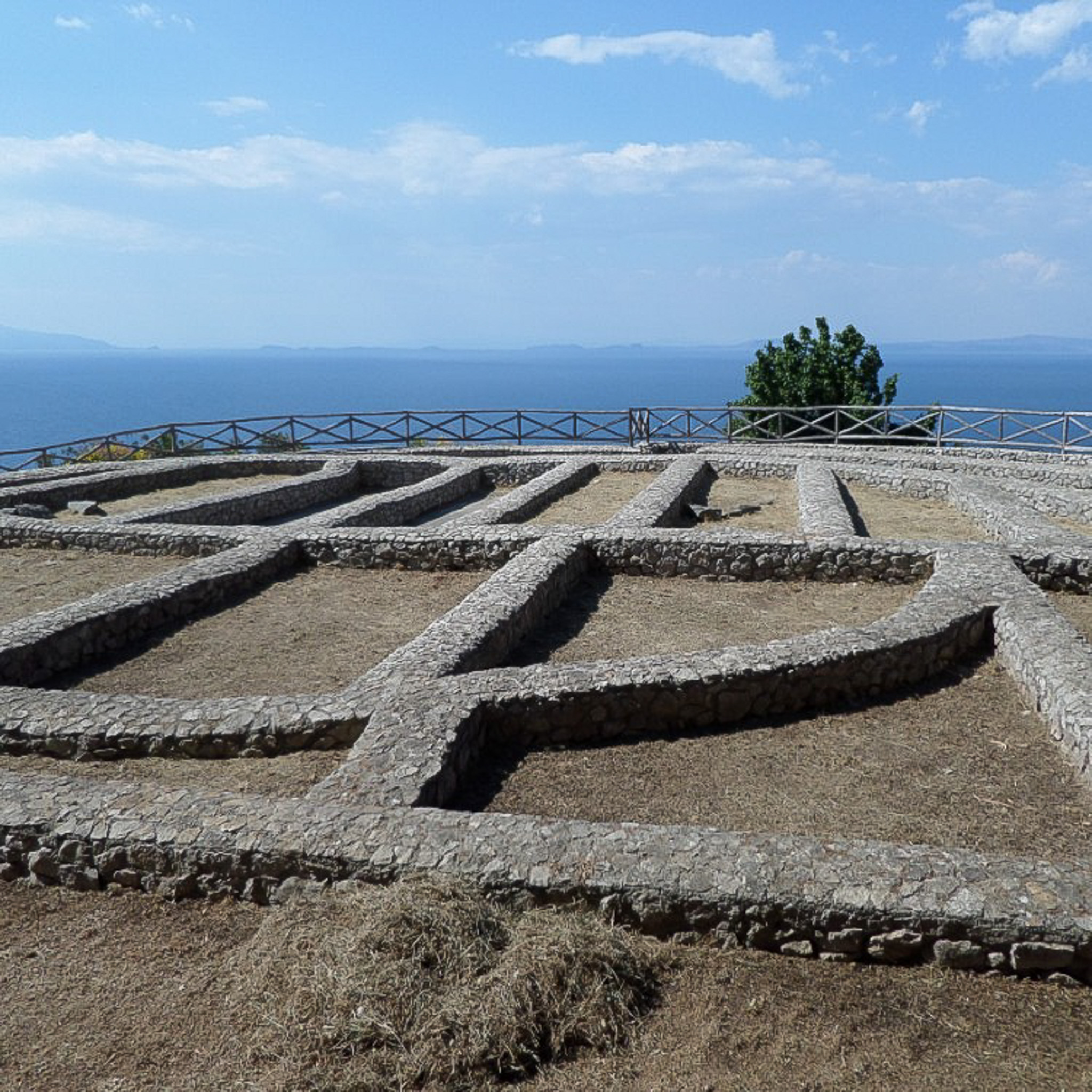 Remains of Villa Damecuta, which is one of twelve Augustan-Tiberian Roman villas on the Island of Capri, Italy. The Roman villa is in ruins today due to the eruption of Vesuvius in 79 A.D. and many raids by pirates. The ruins is located a short walk between the Blue Grotto and the municipality of Anacapri. "Damecuta" is derived from "Domus Cuta" (Dark and Hidden House), as Emperor Tiberius preferred small living spaces similar to caves. Augustus was the first Roman emperor and was succeeded by his stepson, Tiberius. Experts theorize that the villa contained an 80 meter long loggia with portico, opening out towards the Bay of Naples, which terminated in a large semicircular viewpoint.