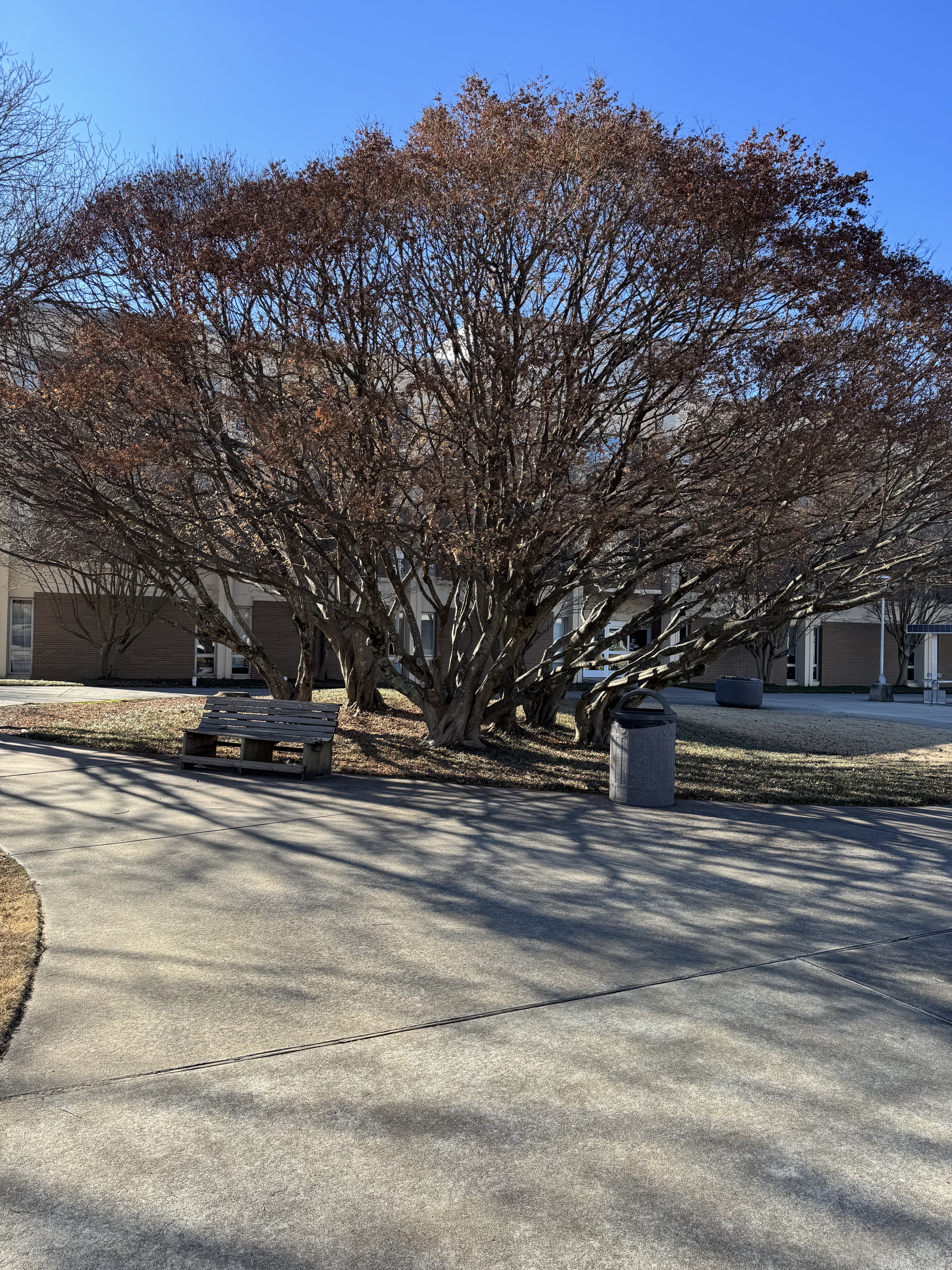 A spreading tree, photographed in winter, sits in a grassy law between intersecting sidewalks. A campus building at the University of West Georgia is in the background. UWG is known for having many trees on its campus.