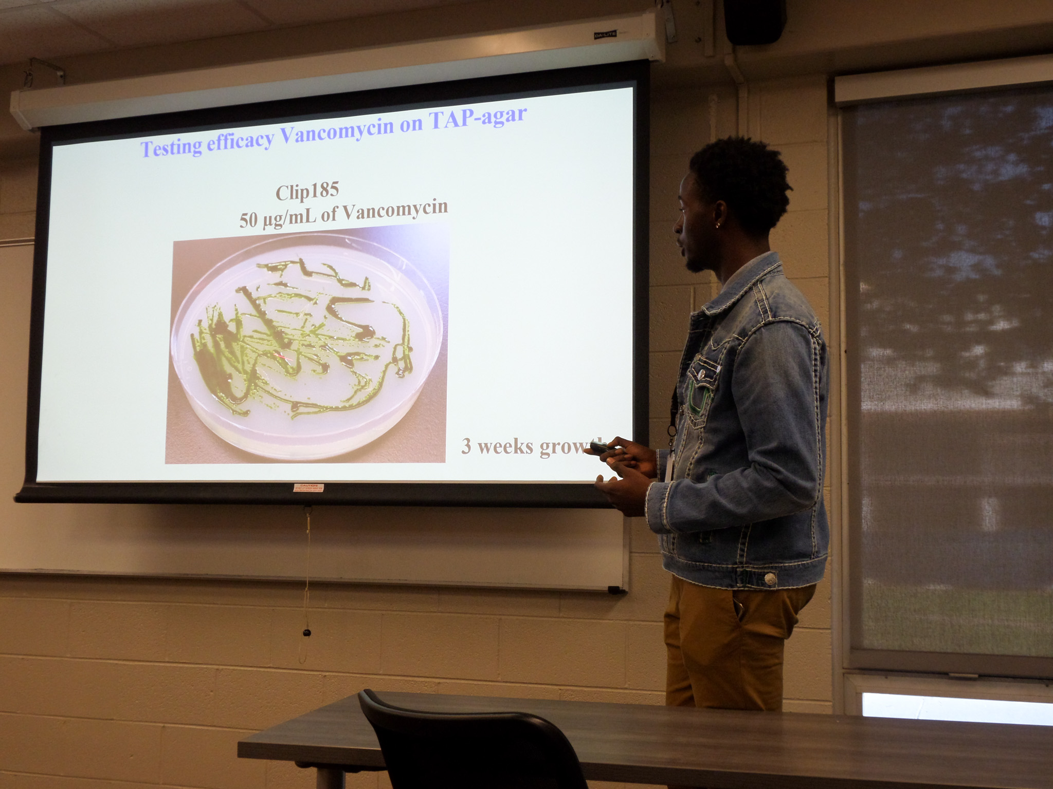 Chukwuemeka (C J) Okpala stands next to a slide show while presenting a paper entitled "Isolation and Biochemical Characterization of a New Microbacterium Species that is a Vitamin B Auxotroph." The presentation was part of the "Microbial Life on Earth and Mars" panel session that took place in UWG's Pafford Hall.