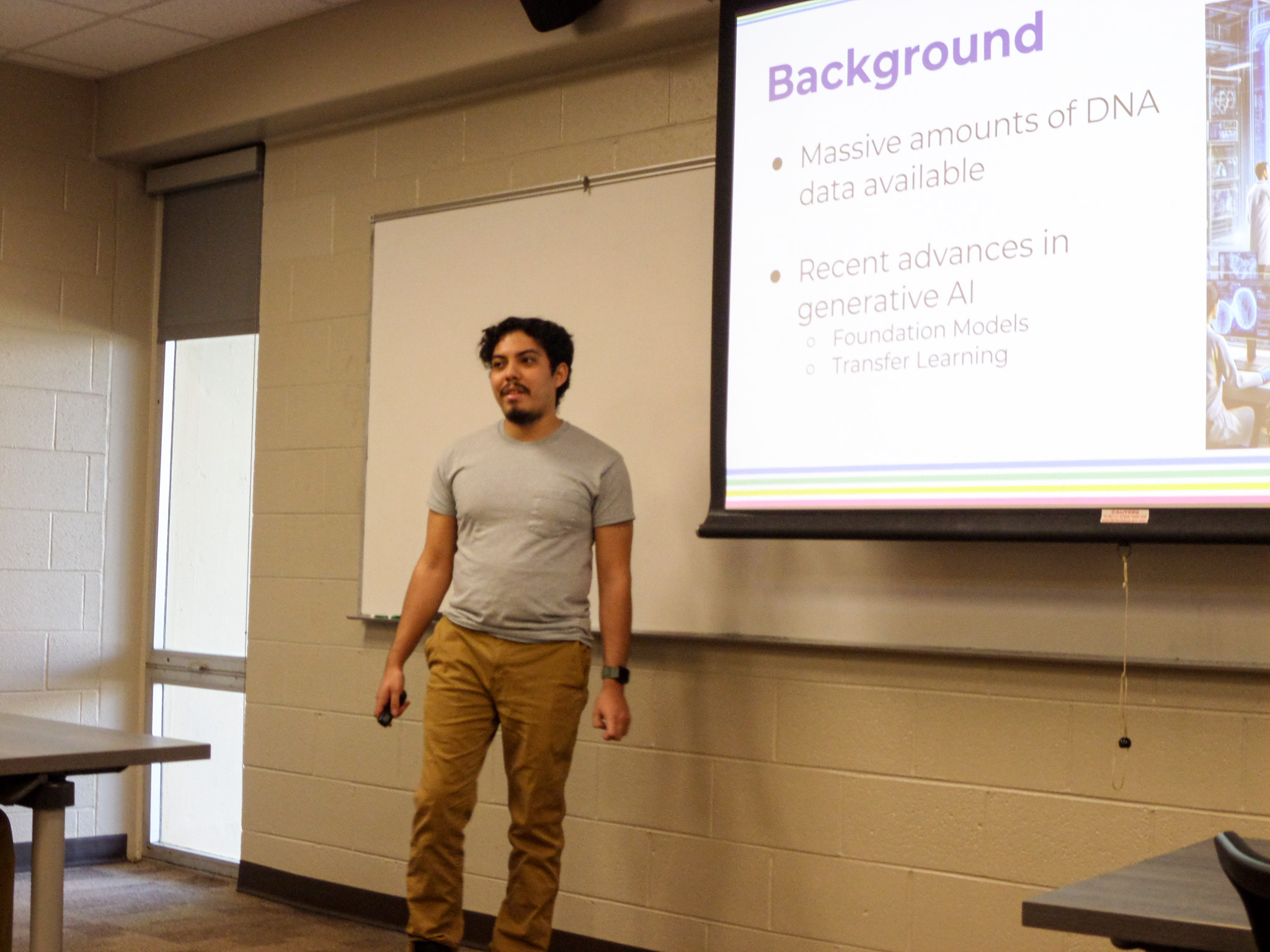 Standing in front of a screen upon which a slide for his presentation, "Functional Annotation of Bacterial Genes Using Recurrent Neural Networks," Trinidad shares his presentation with the audience. Dena's research was completed under the guidance of faculty mentor, Dr. Ana Stanescu and was part of the session entitled, "Microbial Life on Earth and Mars" that took place in a classroom in Pafford Hall during the Undergraduate Research Conference.