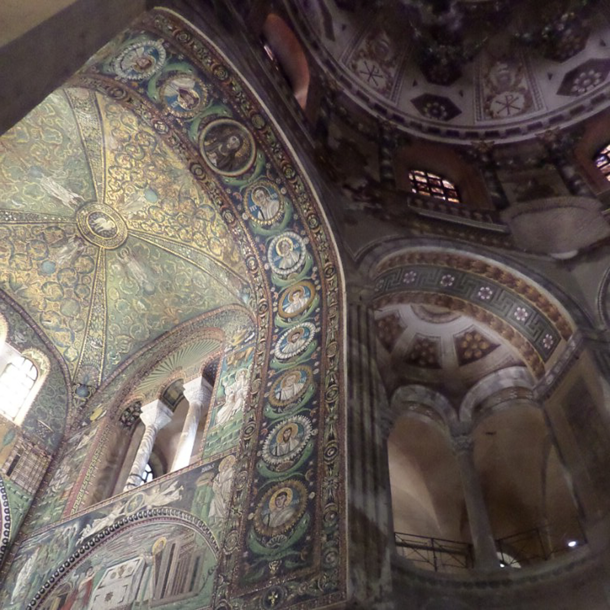 Triumphal Arch Mosaics in the Basilica San Vitale (Basilica of St. Vitale; Church of Saint Vitale) in Ravenna, Italy. A total of fifteen mosaic medallions line the intrados of the arch to the Presbytery, depicting Jesus Christ, the twelve Apostles, and Saint Gervasius and Saint Protasius, who were the sons of Saint Vitale. Ten medallions, including that of Jesus (at the top of the arch), are pictured in the photograph. Green intertwined dolphins, which represent salvation, appear under each medallion. Gold fascia with twining flowers, birds, and horns of plenty surround the medallions.