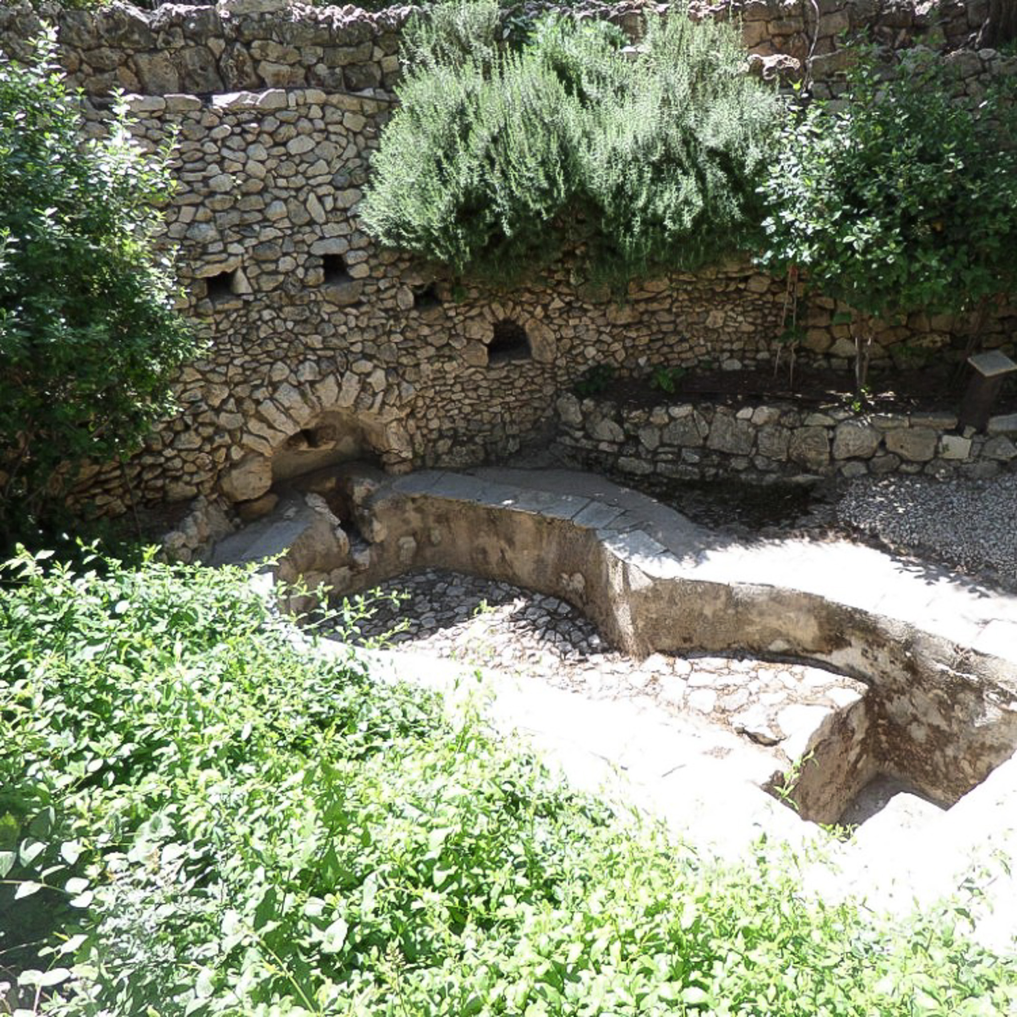 Pathways around the Garden Tomb, surrounded by plants.