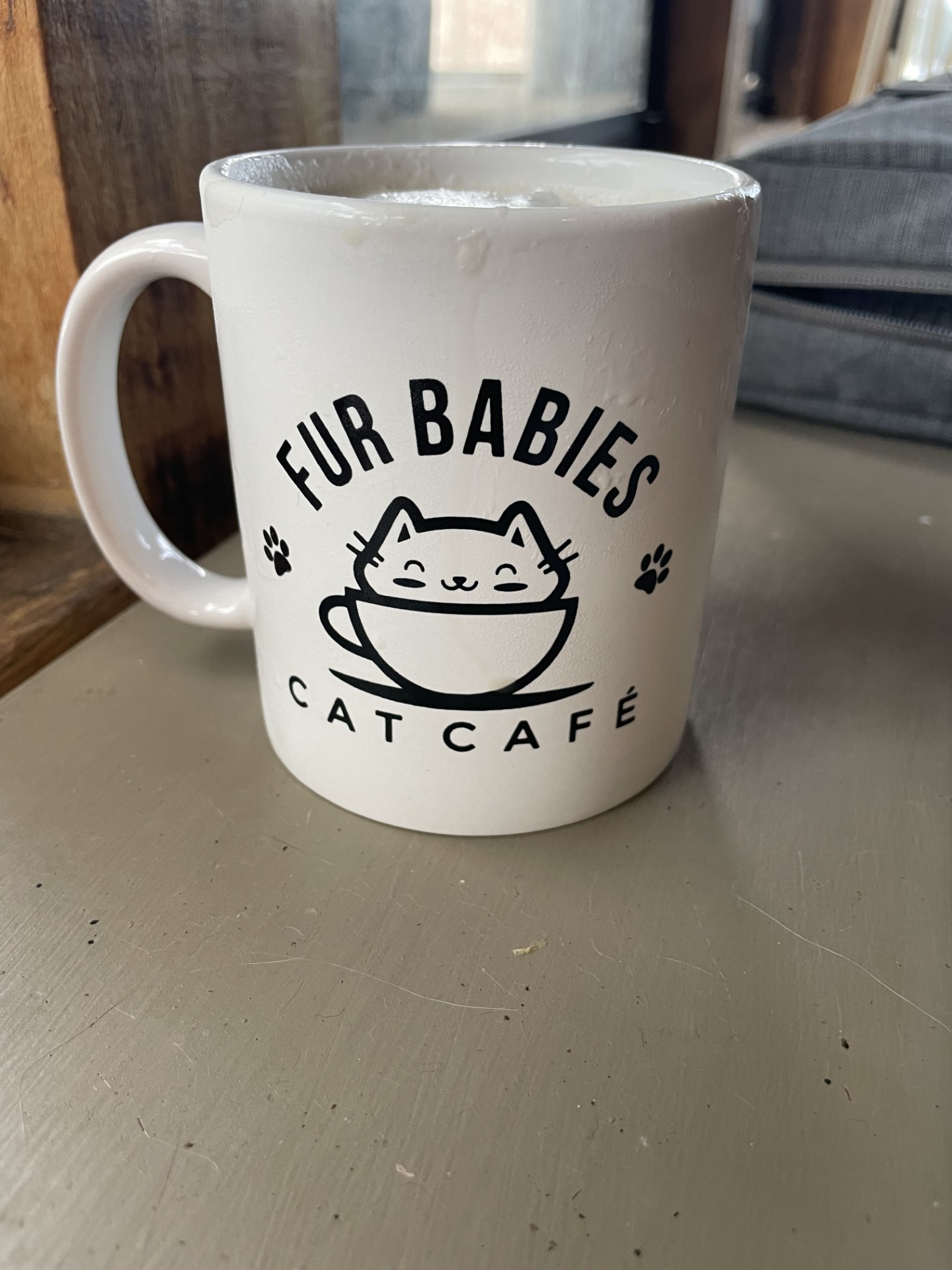 This photo is of a white mug with the words "Fur Babies Cat Cafe". It includes a logo of a cat in a coffee cup. The cat is peaking over the rim of the cup.