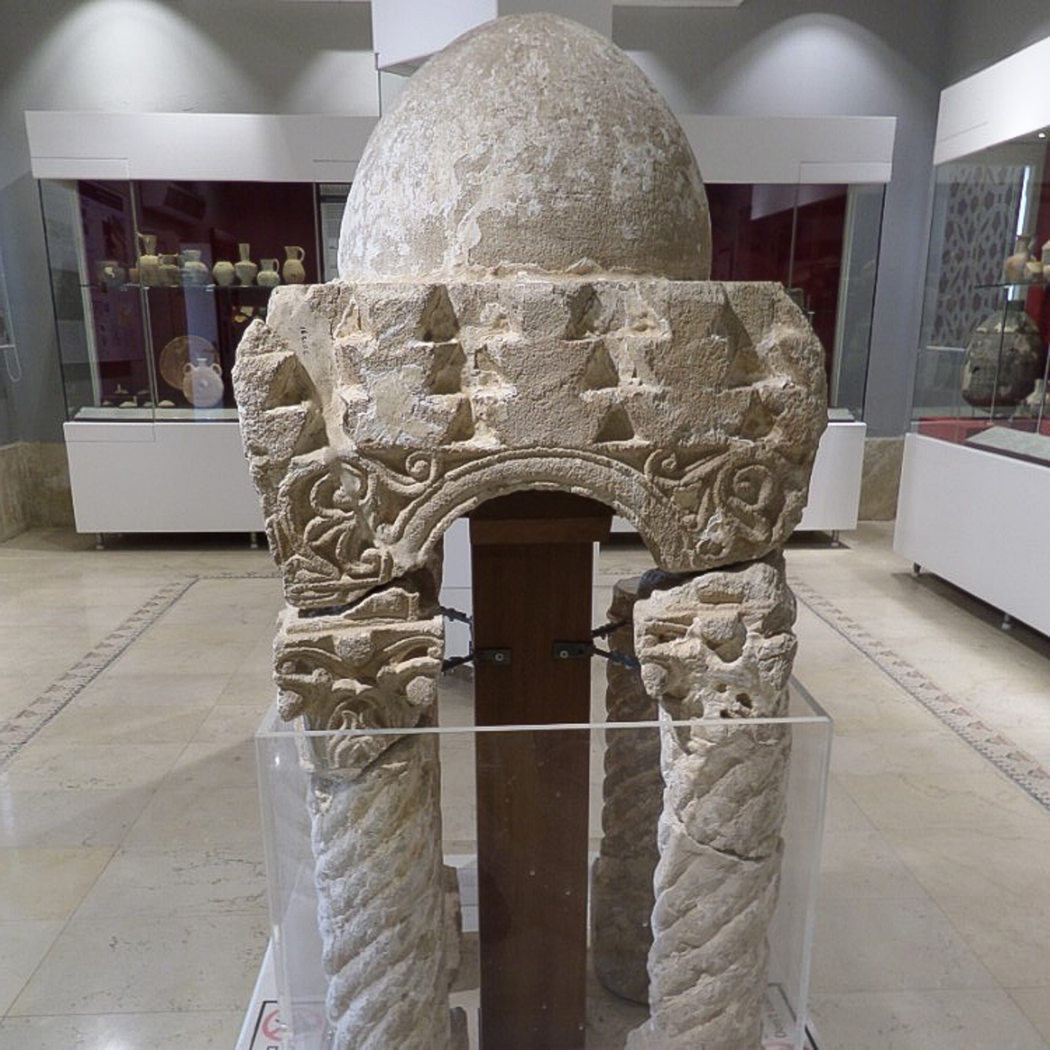 A cupola on display in the on-site museum. It has carved sandstone columns and floral decorations.