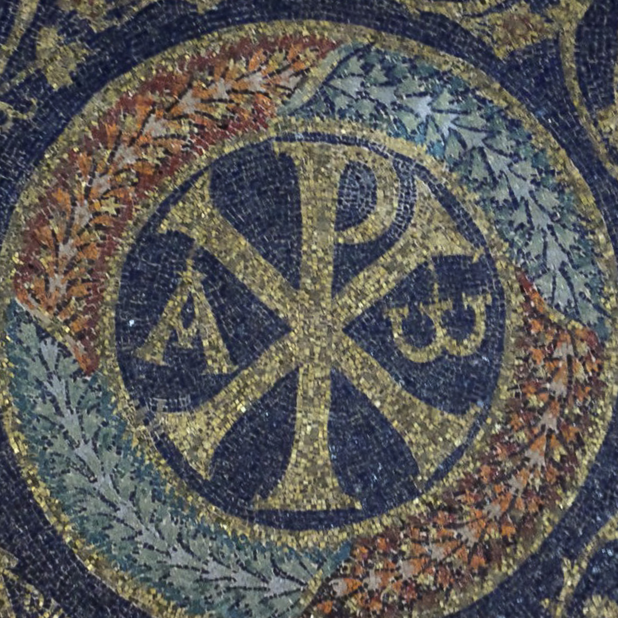 Closer view of the central medallion victory wreath mosaic within the ceiling of a barrel vault in the Mausoleo di Galla Placidia (Galla Placidia Mausoleum; Mausoleum of Galla Placidia) in Ravenna, Italy. The center contains a Chi-Rho, which is the first two letters of Christ's name in Greek (XP), flanked by the beginning and end symbology of the Alpha and Omega, which are also Greek letters.