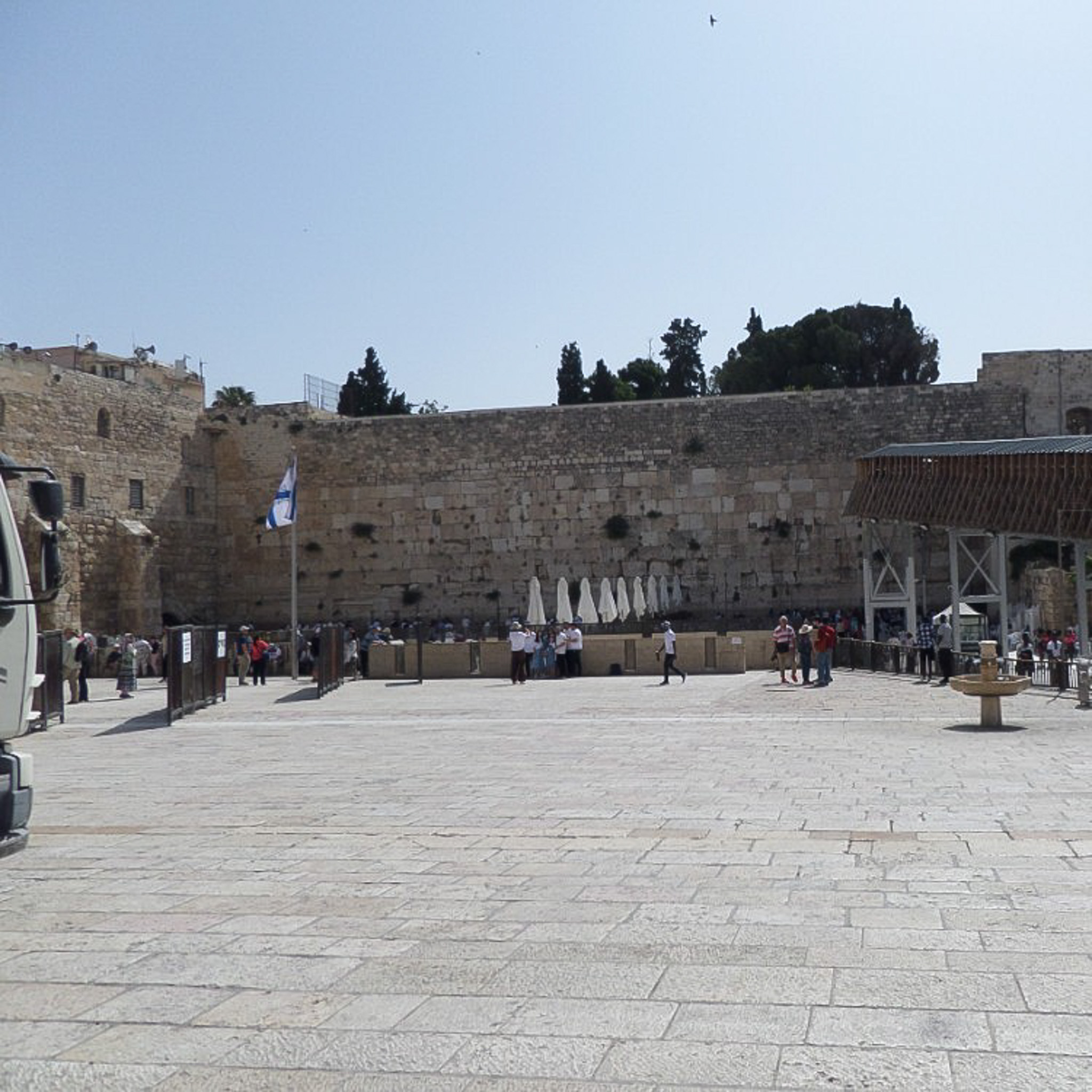 The umbrellas divide the larger men's section from the smaller women's section of the Western Wall. In the foreground is a fountain for purification and handwashing.