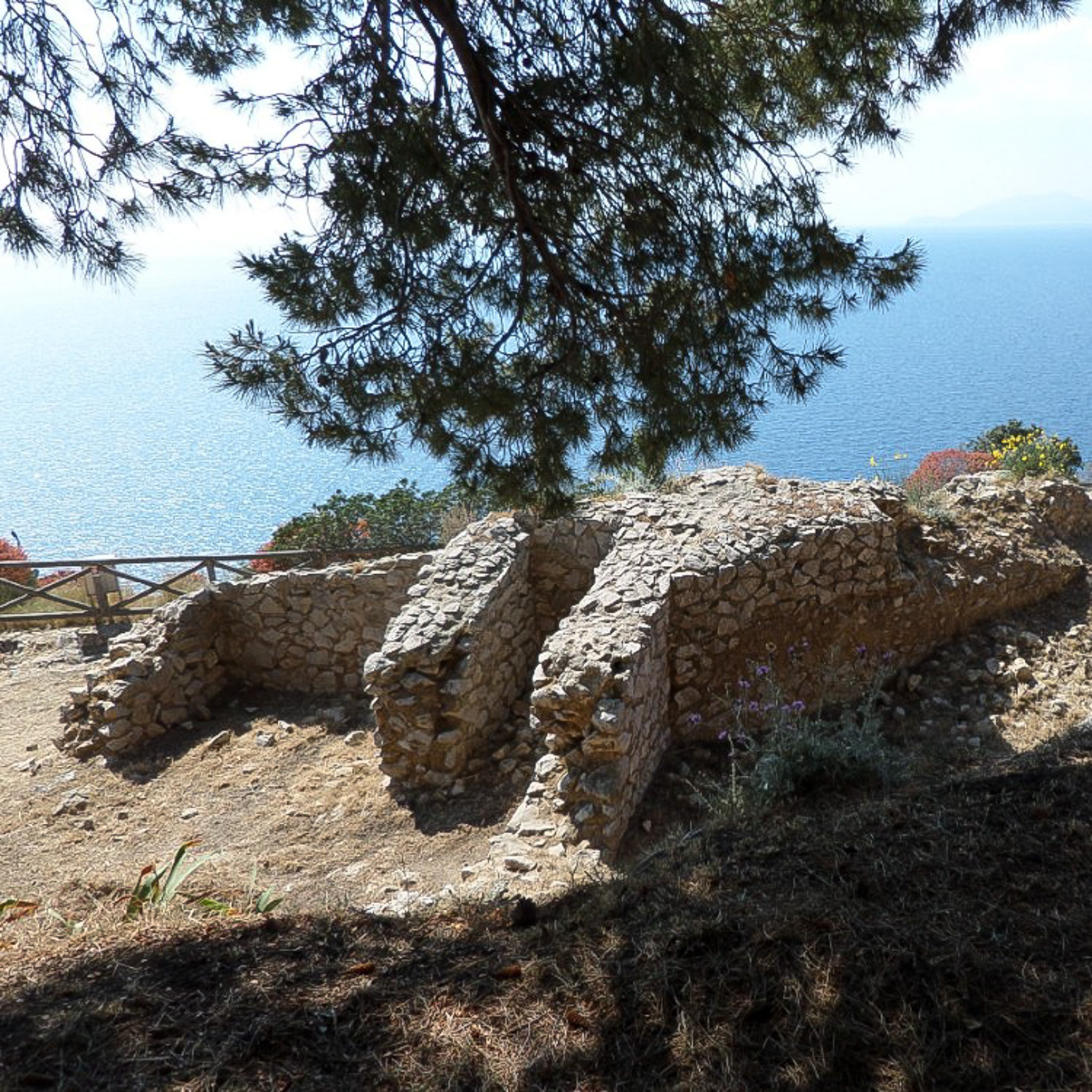 Remains of Villa Damecuta, which is one of twelve Augustan-Tiberian Roman villas on the Island of Capri, Italy. The Roman villa is in ruins today due to the eruption of Vesuvius in 79 A.D. and many raids by pirates. The ruins is located a short walk between the Blue Grotto and the municipality of Anacapri. "Damecuta" is derived from "Domus Cuta" (Dark and Hidden House), as Emperor Tiberius preferred small living spaces similar to caves. Augustus was the first Roman emperor and was succeeded by his stepson, Tiberius.