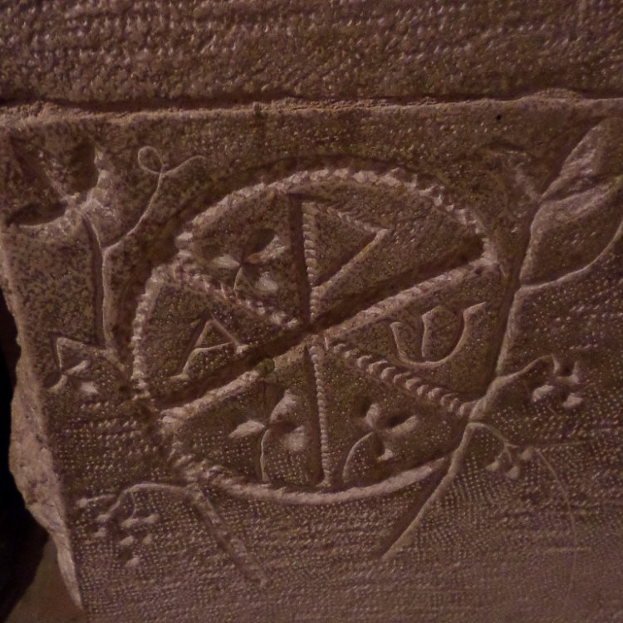 The Roman Catholic section of the cave system includes several altars and burial chambers associated with Jerome, Paula and Eustonchium. Here there is a twentieth century carving of a symbol that includes the Greek intersecting letters chi and rho (for Christ), along with the alpha (beginning) and omega (end). The architecture within the portion of the cave complex controlled by St. Catherine's is a combination of 1960's style and the original primitive cave system.