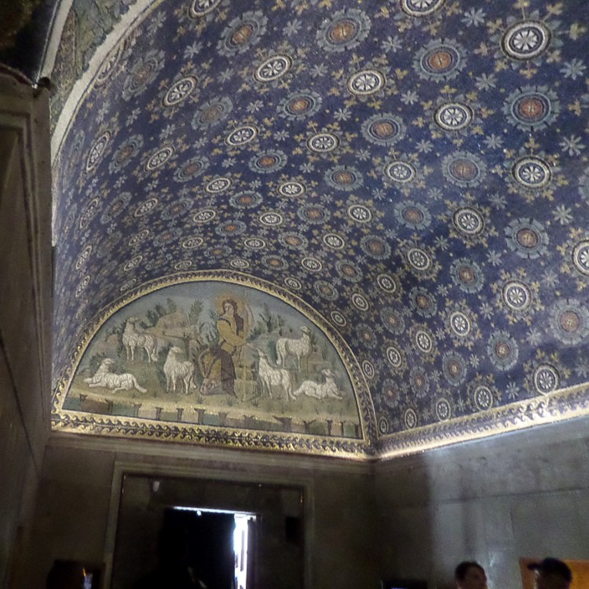A view of "The Good Shepherd" mosaic directly above the entrance to the Mausoleo di Galla Placidia (Galla Placidia Mausoleum; Mausoleum of Galla Placidia) in Ravenna, Italy. The Good Shepherd is a metaphor for Yahweh (God) in the Old Testament, but represents Jesus Christ in the New Testament (John 10:1�21), who lays down his life for his sheep. The placement of this mosaic over the entrance alludes to the concept that only through Christ can we reach eternal peace. The mosaic depicts the Shepherd with a calm, beardless face, wearing a golden tunic and purple mantle, with a large cross and a golden halo. The figure is posed on rocks among six sheep. Above the Good Shepherd is the mosaic decoration of a barrel vault: moonflowers in a deep blue sky.