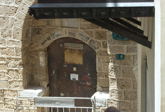 Door of the privately owned dwelling that is purportedly owned by Simon the Tanner mentioned in Acts 9:43, 10:5-8 and 10:31-32 Paul stayed there when he visited Jaffa. Writing painted on the door jam reads in English, "House of Simon the Tanner's" and underneath in German, "Der Gerbe," which translates to "the tanner" in English. A plaque on the door reads, "The Zakarian Family."