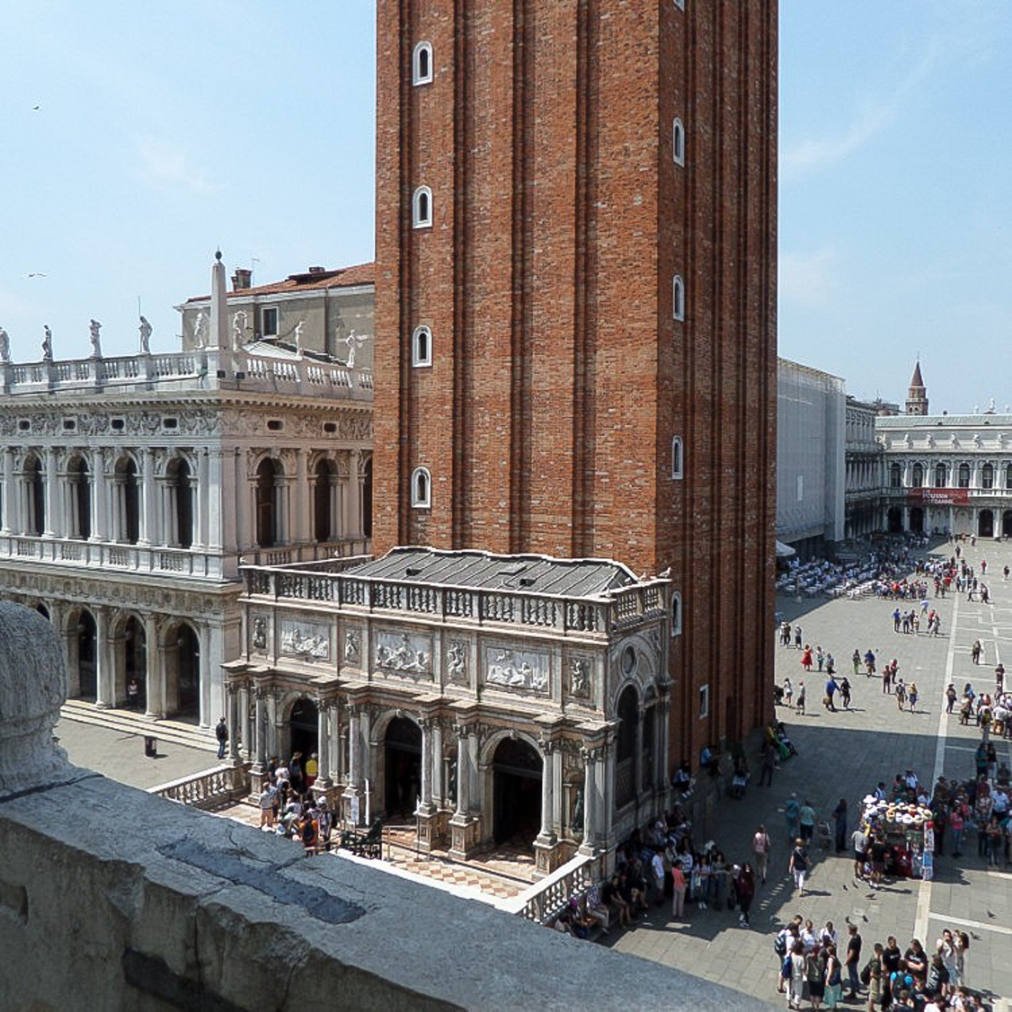 This photograph shows the Sansovino Lodge at the base of the bell tower (in Italian: campanile) in St. Mark's Square, Venice, Italy. Venice (Venezia) is a city in northeastern Italy that is built on a group of 126 islands separated by open water and canals, linked through 472 bridges. The historical island city is home to only 51K people, but a very popular tourist destination with about 60K tourists per day. A UNESCO World Heritage Site, it is renowned for its beauty, architecture, and artwork. The district of San Marco's defensive location on the large firm islet, with commanding views of the Basin of San Marco and its route to the sea and also the entrance to the Grand Canal, made it a natural choice for the fortified palace of the doge (chief magistrate). In the San Marco district, the square is the city's main gathering place for tourists and contains the city's most famous buildings, such as St. Mark's Basilica and the Doge's Palace. The bell tower, also known as the Campanile di San Marco, is 323 feet tall and stands in the southeast corner of the square. The Sansovino Lodge (Loggetta del Sansovino), designed by the Florentine architect Jacopo Sansovino, is an ornate building of marble and bronze with statues and relief sculptures. It was used as a gathering place for the Grand Council before sessions. The building was largely destroyed when the bell tower collapsed in 1902, but it was rebuilt using about half of the original material.
