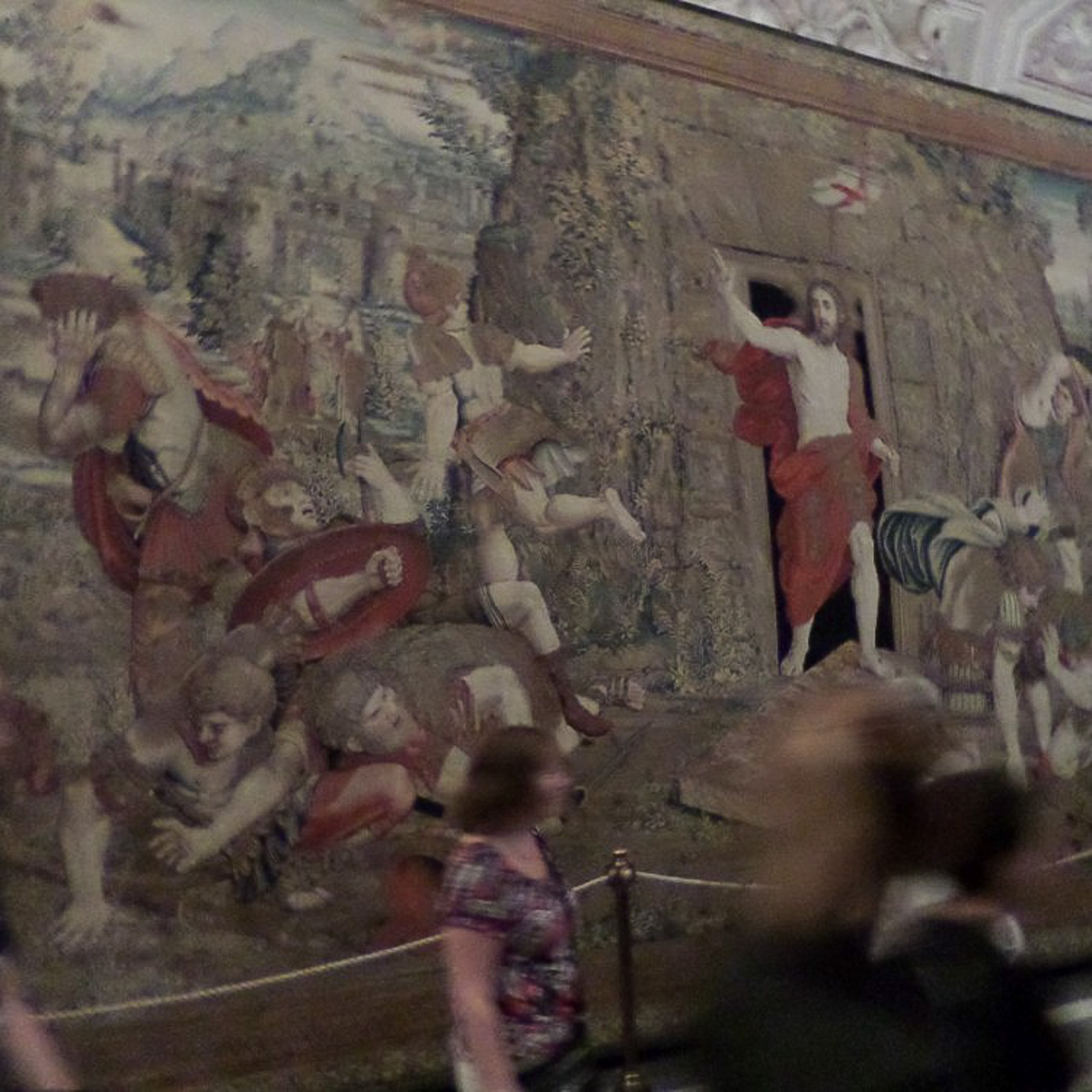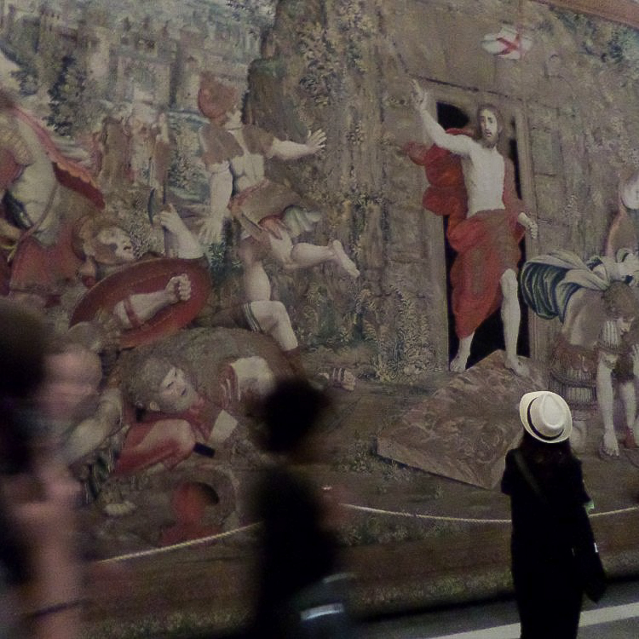 Multiple photos are associated with this record. Please click the links to view all of the items in the series. The photos show signage and a tapestry designed by Raphael within the Gallery of Tapestries (Galleria degli Arazzi), which is part of the Vatican Museums. These are public museums that display about 20,000 of 70K works collected by the Catholic Church and the papacy throughout the centuries. The museums were founded by Pope Julius II in the early 16th century. Only the Louvre in France receives more annual visitors than the Vatican Museums. The museums consist of 24 galleries, with the Sistine Chapel being the last room visited. The photographed tapestry is "Resurrection of Christ," also known as "Resurrection of Our Lord." It is widely regarded as the finest of the tapestries displayed in this gallery. Raphael did not live to see this cycle of tapestries on the life of Christ completed, so his pupils did the work from his drawings.