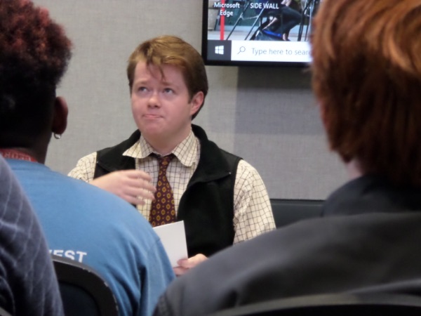 Jackson Rimmer reads his paper, "The Comparative Communities of 'Much Ado About Nothing'" during the "Nation and Culture" panel of the 2024 Humanities Undergraduate Research Conference held at the University of West Georgia. Rimmer's faculty advisor for the project was Dr. Maria Doyle. Rimmer is wearing a beige dress shirt, dark vest, and maroon tie.