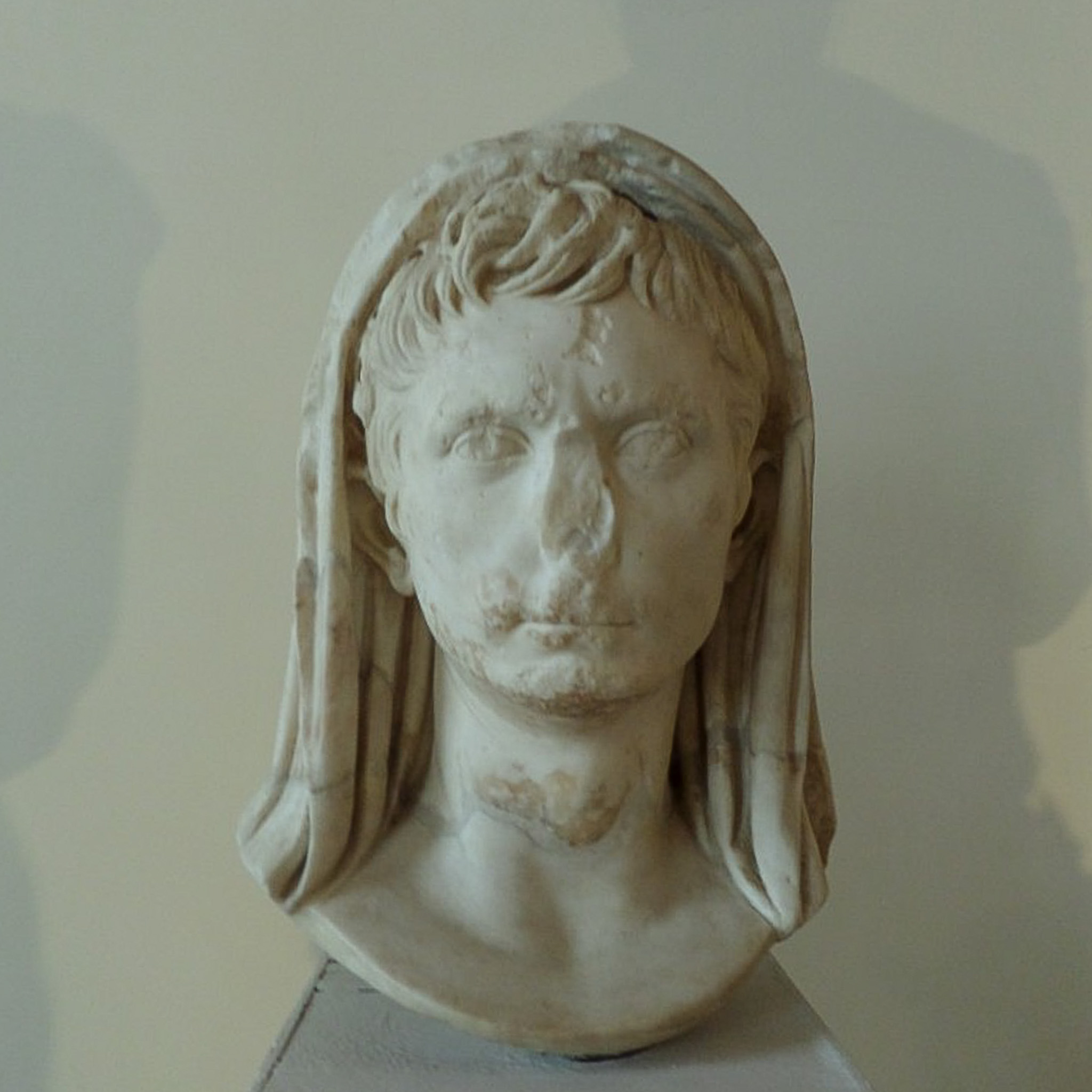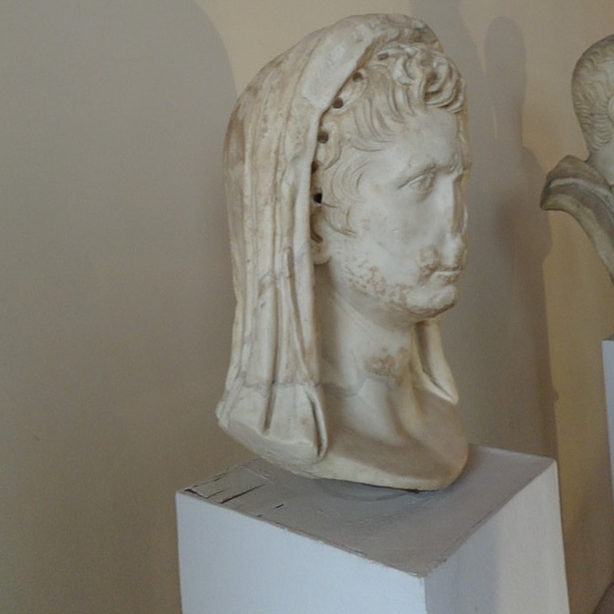 Multiple photos are associated with this record. Please click the links to view all of the items in the series. The photos were taken in the Royal Palace of Venice (in Italian: Il Palazzo Reale) in the San Marco district on the island of Venice, Italy. Venice (Venezia) is a city in northeastern Italy that is built on a group of 126 islands separated by open water and canals, linked through 472 bridges. The historical island city is home to only 51K people, but a very popular tourist destination with about 60K tourists per day. A UNESCO World Heritage Site, it is renowned for its beauty, architecture, and artwork. The landmark of St. Mark's Square (Piazza di San Marco) is the basilica dedicated to Saint Mark the Evangelist and contains his relics. The church is sited on the eastern end of the square, the former center of the Republic of Venice, and is attached to the Doge's Palace. There are other important landmarks around this square, such as the Royal Palace of Venice, which is a complex that consists of the Marciana Library, the Archaeological Museum, and the Correr Museum (Museo Correr). The Correr Museum's items originated with Teodoro Correr, a passionate collector who bequeathed his collection to the city of Venice in 1830. The photos show signage and a bust of Augustus (63 BCE to 14 CE). He was the founder of the Roman empire, ruling as emperor from 27 BCE until his death in 14 CE. The portrait is of the prince as Pontifex Maximus (chief high priest of the College of Pontiffs) and dates back to ca. 10 BCE. The head covering was utilized when he was acting as a priest in official ceremonies.