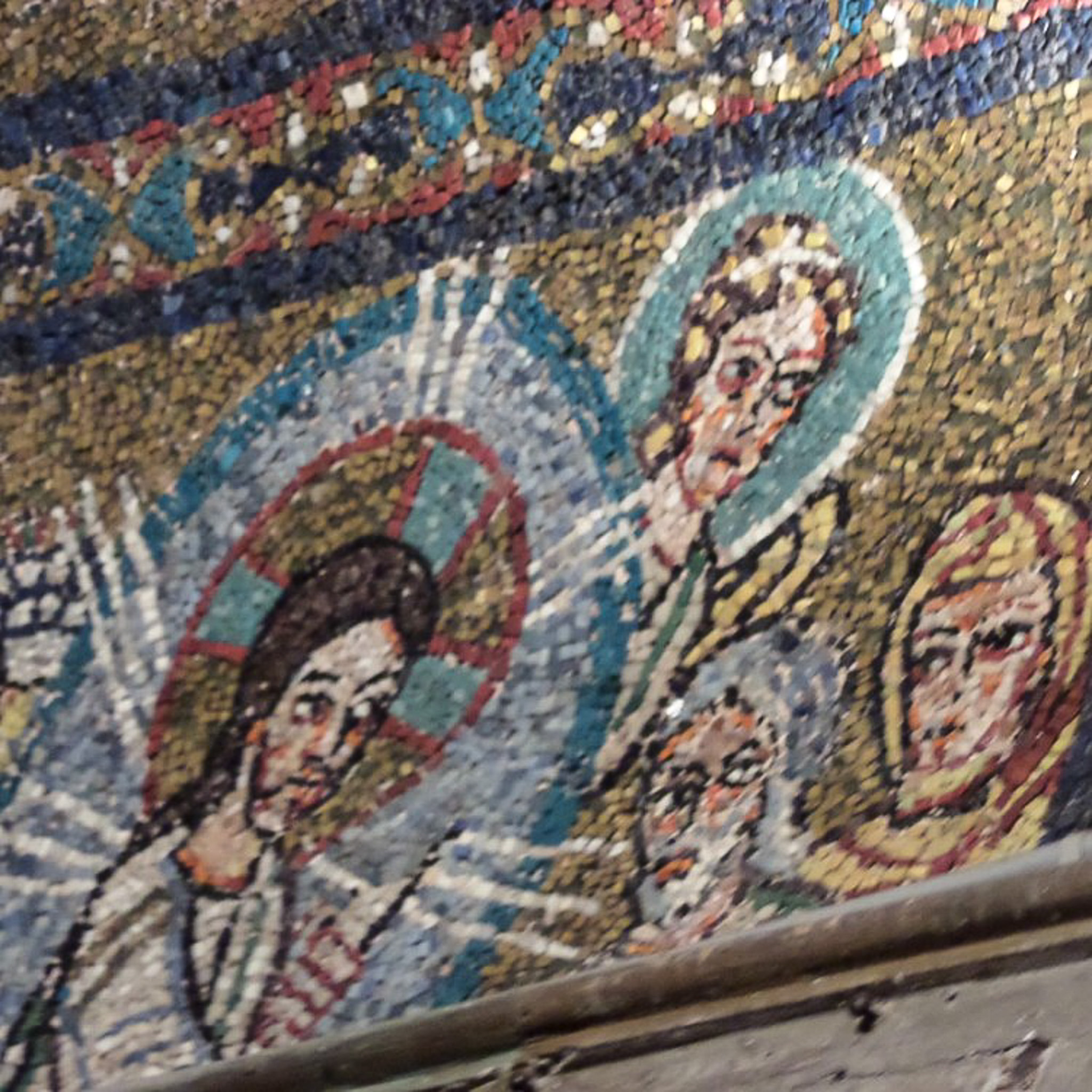 The Basilica of Saint Praxedes (in Italian: Basilica di Santa Prassede, commonly known as Santa Prassede) is a Catholic basilica located in the Rione Esquilino (or district of Esquiline). Esquiline is the name of a Roman hill, one of seven on which the ancient city was built. The church was rebuilt by Pope Pasquale I in 822 CE and was restored multiple times since then. It was built principally as a resting place for the relics of Roman martyrs and was dedicated to the second-century Saint Praxedes, who was the daughter of a Roman senator. Along with her sister, Praxedes provided comfort and care to Christians persecuted in the Roman Empire. The sisters were murdered for burying early Christian martyrs, which defied Roman law. The church is known for being the most important example of early Christian Byzantine art in Rome because of the mosaics decorating its apse and side chapels. The photograph shows part of the architecture and mosaic decoration of the right lateral Chapel of Saint Zeno (Cappella di San Zenone) within the Basilica. Pope Paschal built the funerary chapel for his mother, Theodora. The mosaic depicts Jesus Christ and his followers. In religious iconography, Christ's halo is divided into three sections, symbolizing the Father, Son, and Holy Spirit; in this mosaic, three bands of blue symbolize the Trinity. Saints, on the other hand, are depicted with solid halos.