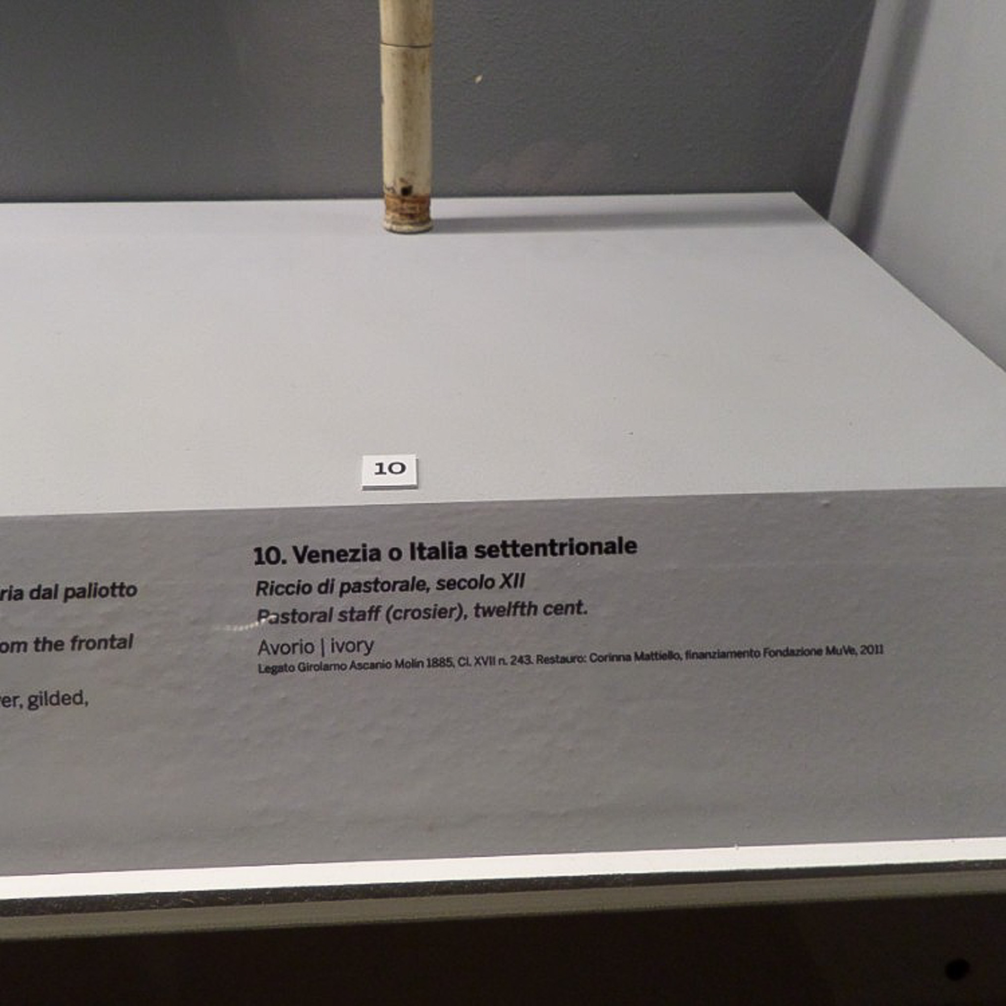 Multiple photos are associated with this record. Please click the links to view all of the items in the series. The photos were taken in the Royal Palace of Venice (in Italian: Il Palazzo Reale) in the San Marco district on the island of Venice, Italy. Venice (Venezia) is a city in northeastern Italy that is built on a group of 126 islands separated by open water and canals, linked through 472 bridges. The historical island city is home to only 51K people, but a very popular tourist destination with about 60K tourists per day. A UNESCO World Heritage Site, it is renowned for its beauty, architecture, and artwork. The landmark of St. Mark's Square (Piazza di San Marco) is the basilica dedicated to Saint Mark the Evangelist and contains his relics. The church is sited on the eastern end of the square, the former center of the Republic of Venice, and is attached to the Doge's Palace. There are other important landmarks around this square, such as the Royal Palace of Venice, which is a complex that consists of the Marciana Library, the Archaeological Museum, and the Correr Museum (Museo Correr). The Correr Museum's items originated with Teodoro Correr, a passionate collector who bequeathed his collection to the city of Venice in 1830. The photos show an ivory pastoral staff from the 12th century.