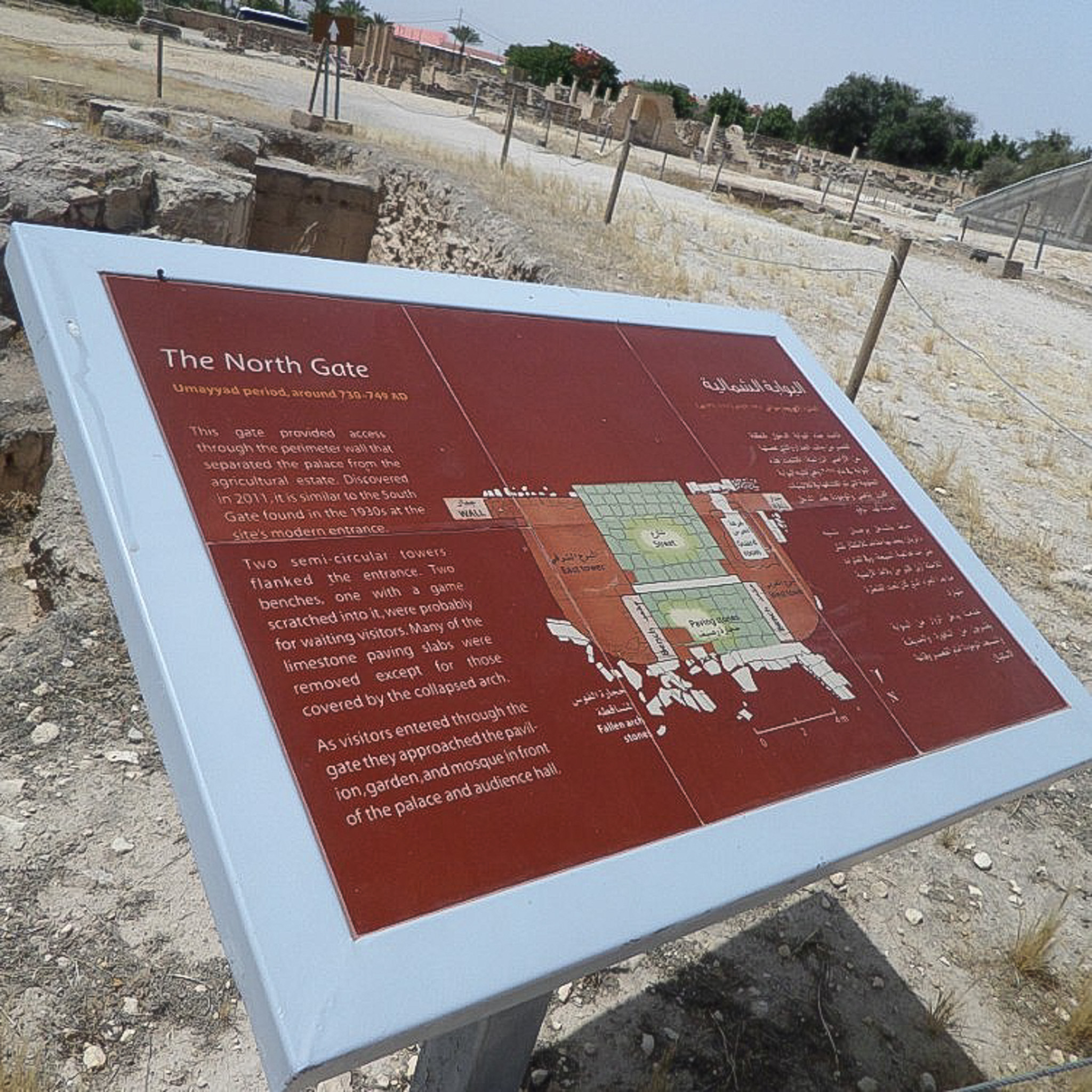 Khirbet el-Mafjar , Qa_r Hish_m , Hisham's Palace , Jericho , West Bank , Desert Castle , Umayyad Dynasty , Islamic Monument , Palestine , Medieval Arabic Architecture , Agricultural Estate , North Gate , Signage