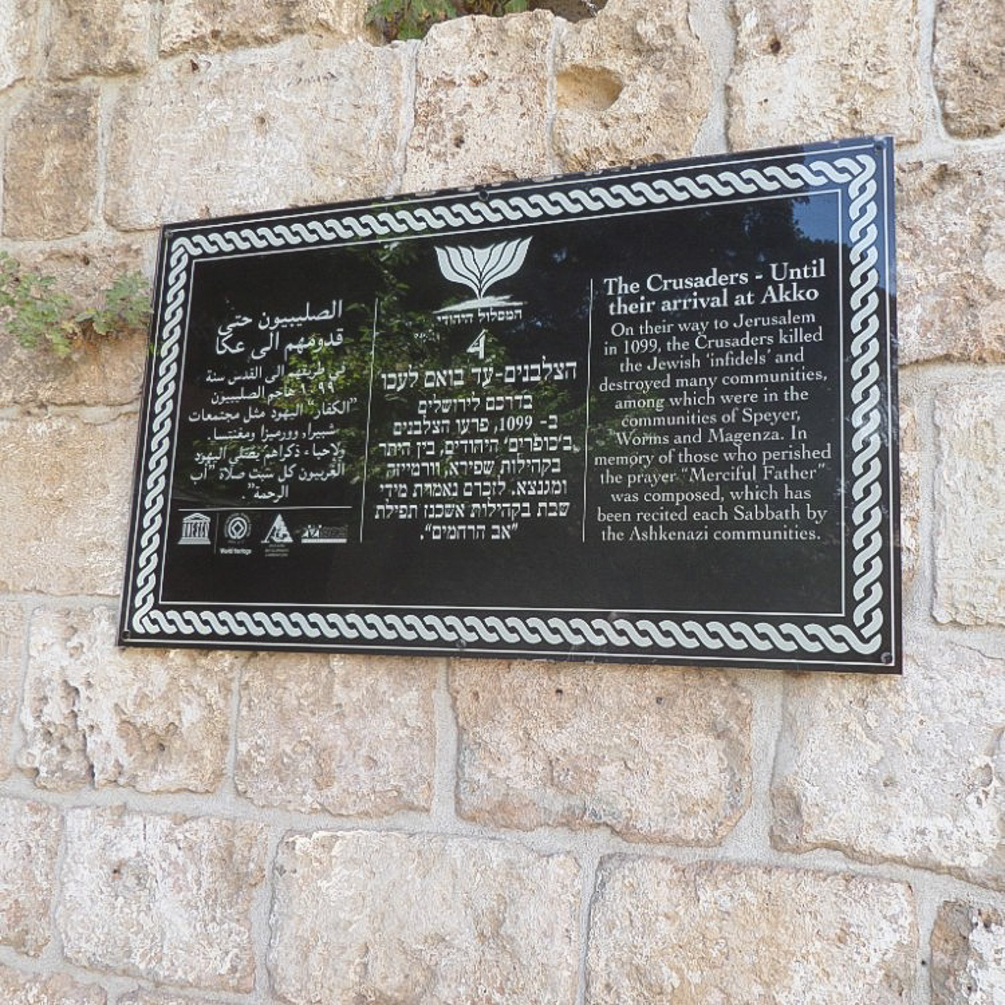 A sign (in Arabic, Hebrew and English) at the Citadel in Acre reads: "The crusaders--until their arrival at Akko. On their way to Jerusalem in 1099, the Crusaders killed the Jewish 'infidels' and destroyed many communities, among which were the communities of Speyer, Worms, and Magenza. In memory of those who perished the prayer "Merciful Father" was composed, which has been recited each Sabbath by the Ashkenazi communities."