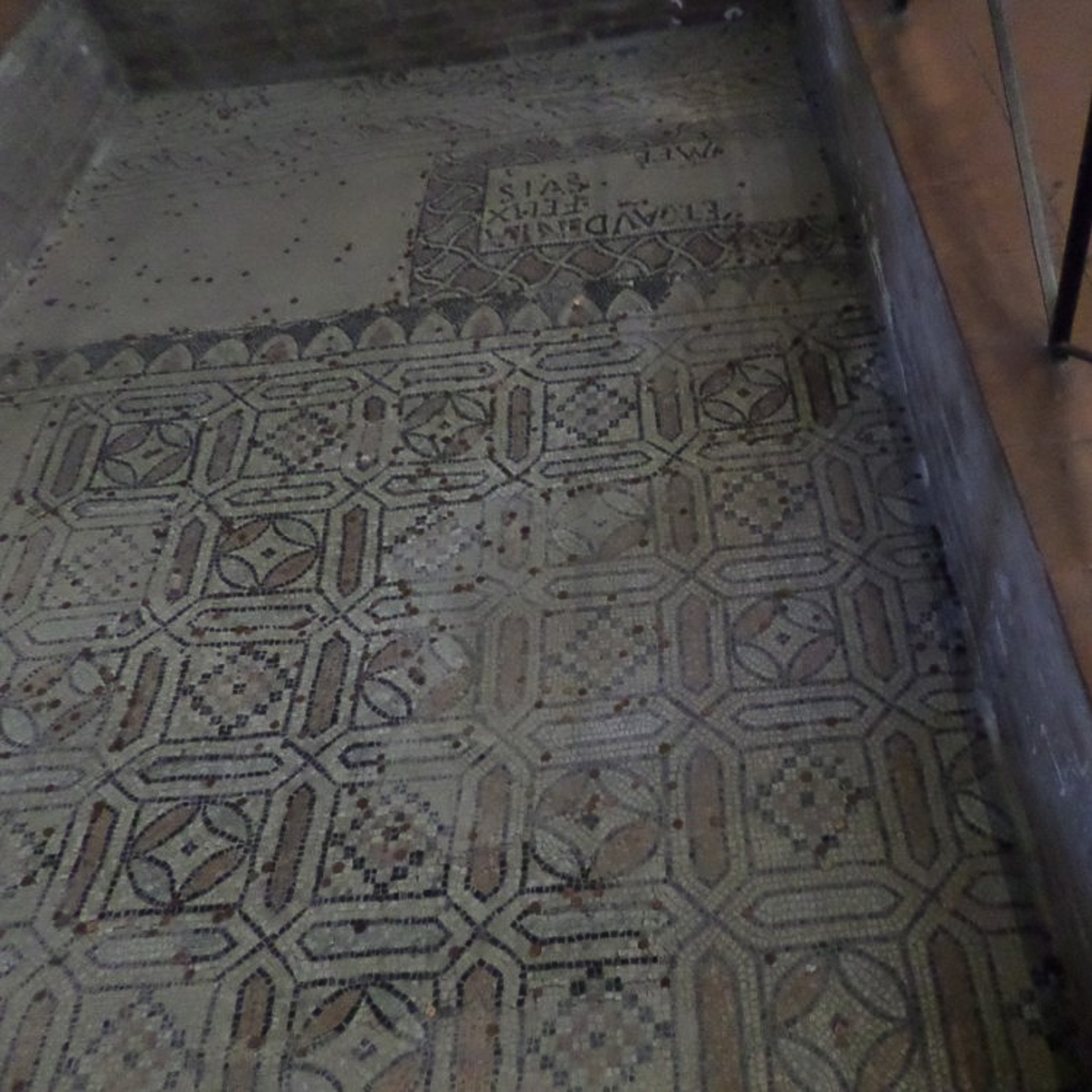 Mosaic tile patterns in what is likely the original floor is visible in a small section of the nave..