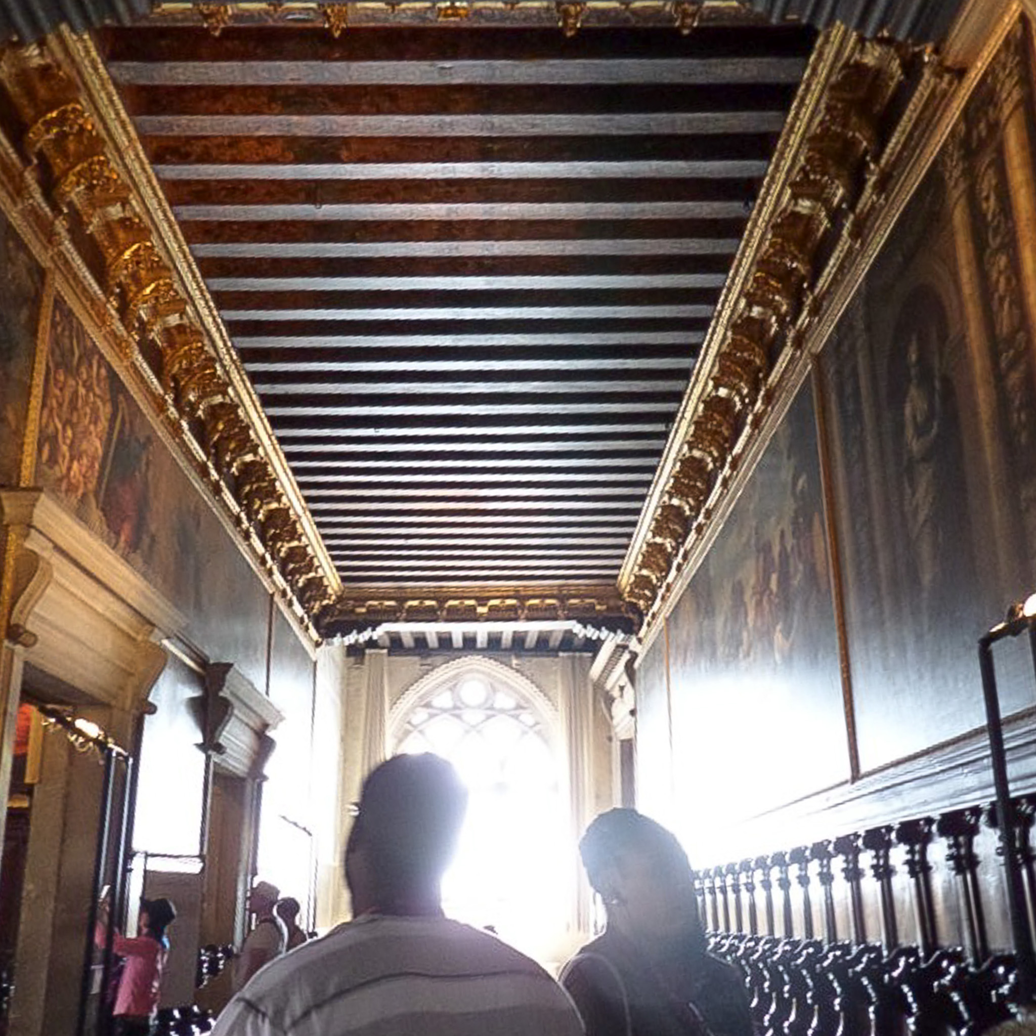 The photo shows the Liago of the Doge's Palace (Palazzo Ducale), which is located in the San Marco district on the island of Venice, Italy. Venice (Venezia) is a city in northeastern Italy that is built on a group of 126 islands separated by open water and canals, linked through 472 bridges. The historical island city is home to only 51K people, but a very popular tourist destination with about 60K tourists per day. A UNESCO World Heritage Site, it is renowned for its beauty, architecture, and artwork. The Doge (chief magistrate) of Venice was the supreme authority of the Republic of Venice when this palace was built in 1340. Upon exiting the Armoury on the second floor of the palace, one enters the Liago, which was a corridor/meeting place for magistrates in the intervals between meetings. The ceiling consists of painted and gilded beams and the walls feature 17th and 18th century paintings. Although not pictured, this gallery contains three important works of sculpture: Adam, Eve, and The Shield Bearer by Antonio Rizzo (1462-1471).
