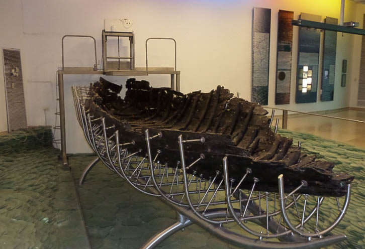 A large portion of a first century wooden fishing boat, often called the Jesus Boat, which was recovered in the Sea of Galilee