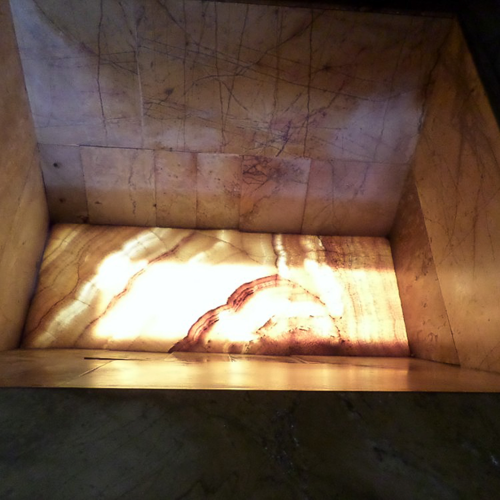 A window in the Mausoleo di Galla Placidia (Galla Placidia Mausoleum; Mausoleum of Galla Placidia) in Ravenna, Italy. The window has thinly sliced alabaster stone, instead of glass, which allows a golden glow to emanate from the window. See https://mandalameadow.com/ravenna-mosaics/ for more information about the windows and other features of the Mausoleum.