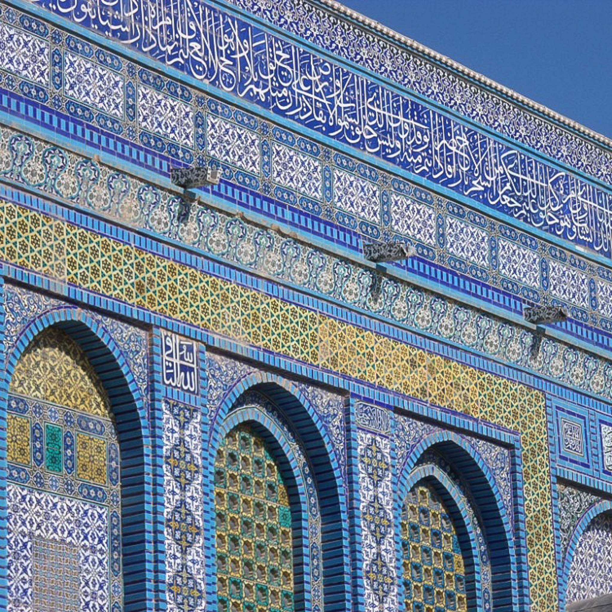 Close up image of the Dome of the Rock, focusing on the detailed Arabic Tiles which make up the fa�ade, Arabic words are on the top while geometric designs are featured on the lower levels.