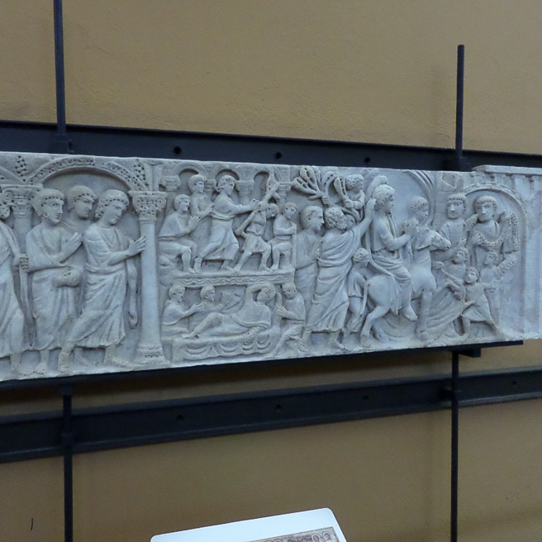 The photograph shows a carved stone that depicts Christ's Passion. It is held in the Pius Christian Museum, which is part of the Vatican Museums. The Vatican Museums are public galleries that display about 20,000 of 70K works collected by the Catholic Church and the papacy throughout the centuries. The museums were founded by Pope Julius II in the early 16th century. Only the Louvre in France receives more annual visitors than the Vatican Museums. The museums consist of 24 galleries, with the Sistine Chapel being the last room visited. The sculpture depicts Christ's triumphal entry into Jerusalem on Palm Sunday, riding a donkey. The cheering crowd waved palm branches and laid cloaks on the ground before him.