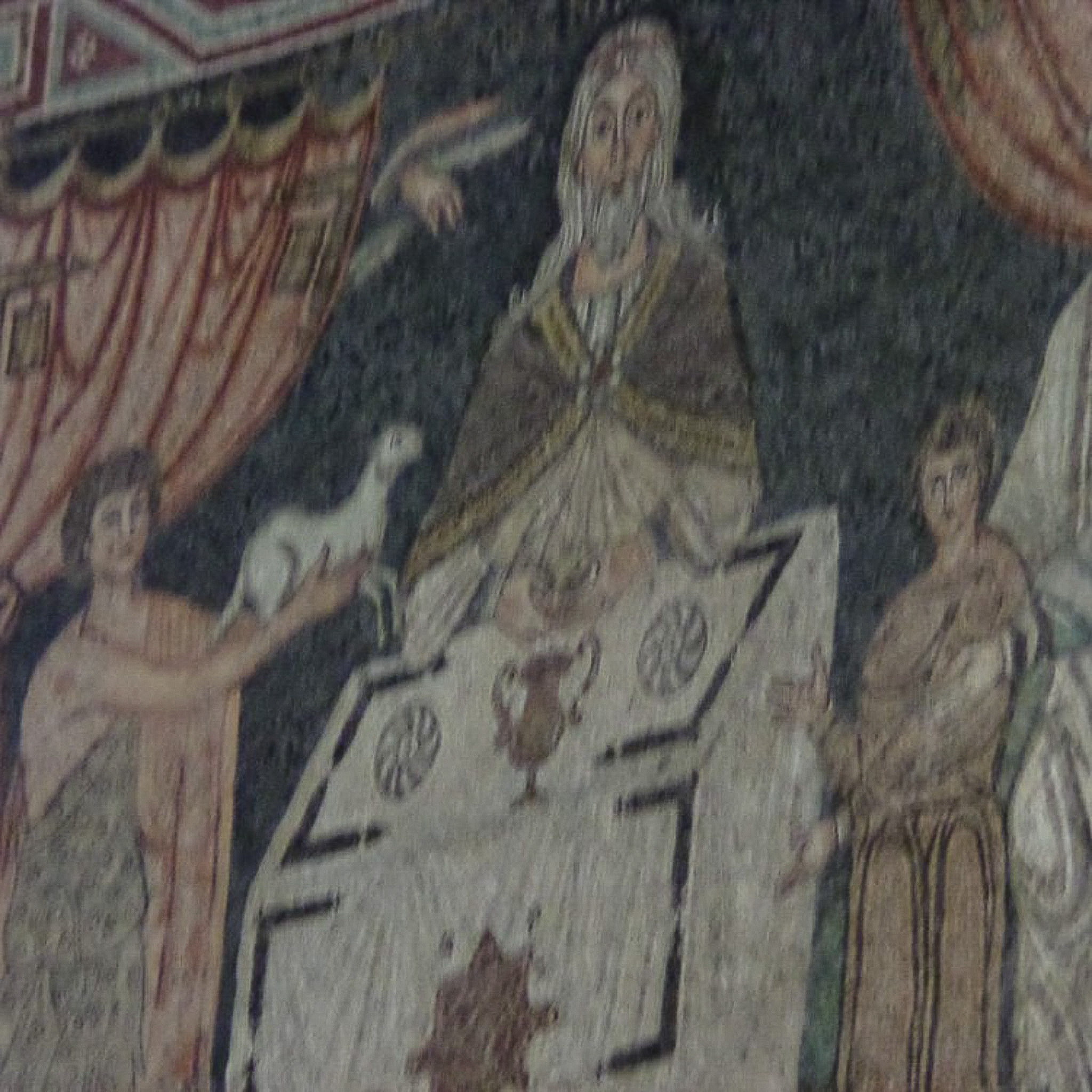 Closer view of the three Eucharist sacrifices of Abel, Melchizedek and Abraham. represented in a mosaic on the south wall of the apsidal conch in the Basilica of St. Apollinare in Classe (or Basilica of Sant'Apollinare in Classe, or Saint Apollinaris in Classe), which is located in Ravenna, Italy. This mosaic appears on the bottom right of the apsidal conch and was added in the 7th century.