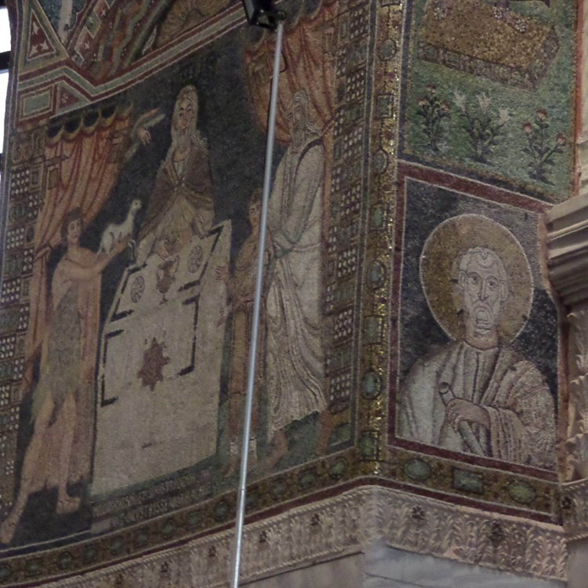 The three Eucharist sacrifices of Abel, Melchizedek and Abraham are represented in a mosaic on the south wall of the apsidal conch in the Basilica of St. Apollinare in Classe (or Basilica of Sant'Apollinare in Classe, or Saint Apollinaris in Classe), which is located in Ravenna, Italy. This mosaic appears on the bottom right of the apsidal conch and was added in the 7th century. A saint on the bottom right of the triumphal arch is pictured on the right of the photo.