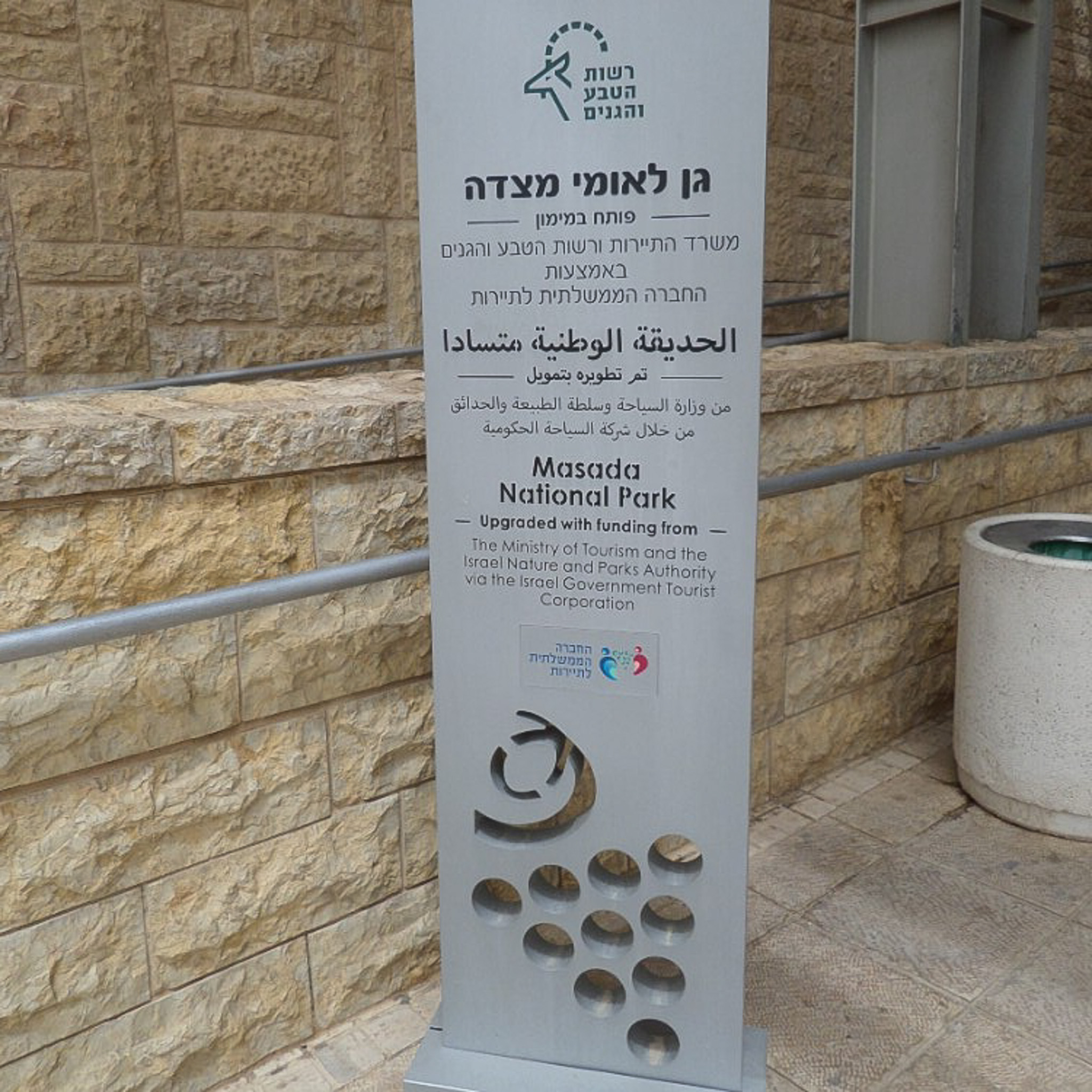 A sign in English, Hebrew, and Arabic, indicates the funding source for the Masada National Park.