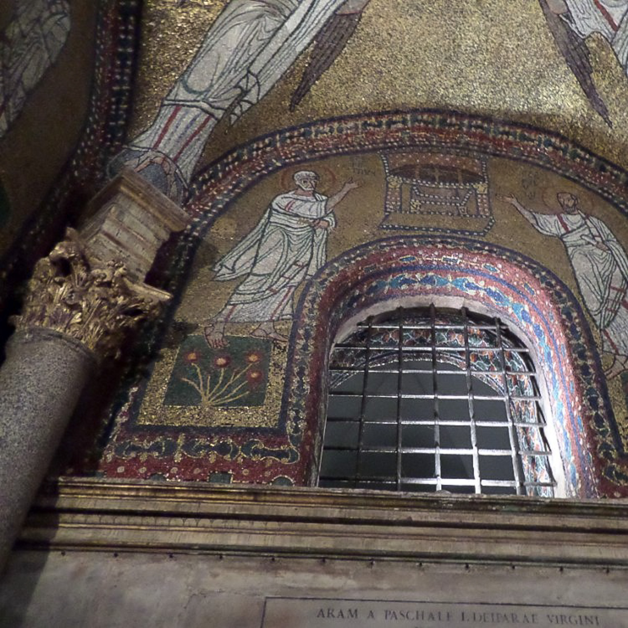 The Basilica of Saint Praxedes (in Italian: Basilica di Santa Prassede, commonly known as Santa Prassede) is a Catholic basilica located in the Rione Esquilino (or district of Esquiline). Esquiline is the name of a Roman hill, one of seven on which the ancient city was built. The church was rebuilt by Pope Pasquale I in 822 CE and was restored multiple times since then. It was built principally as a resting place for the relics of Roman martyrs and was dedicated to the second-century Saint Praxedes, who was the daughter of a Roman senator. Along with her sister, Praxedes provided comfort and care to Christians persecuted in the Roman Empire. The sisters were murdered for burying early Christian martyrs, which defied Roman law. The church is known for being the most important example of early Christian Byzantine art in Rome because of the mosaics decorating its apse and side chapels. The photograph shows part of the architecture and mosaic decoration of the right lateral Chapel of Saint Zeno (Cappella di San Zenone) within the Basilica. Pope Paschal built the funerary chapel for his mother, Theodora. The interior of this chapel is completely covered in mosaic decorations. The photograph shows a depiction of an eastern iconographical theme, the hetoimasia, which is a Greek term meaning "preparation of the throne." An empty throne signifies awaiting the Second Coming of Christ for the Day of Judgment. In the mosaic, representations of Saint Peter and Saint Paul gesture to the throne; they are protectors of the Roman church. The flowers at their feet depict the heavenly garden of eternal spring.