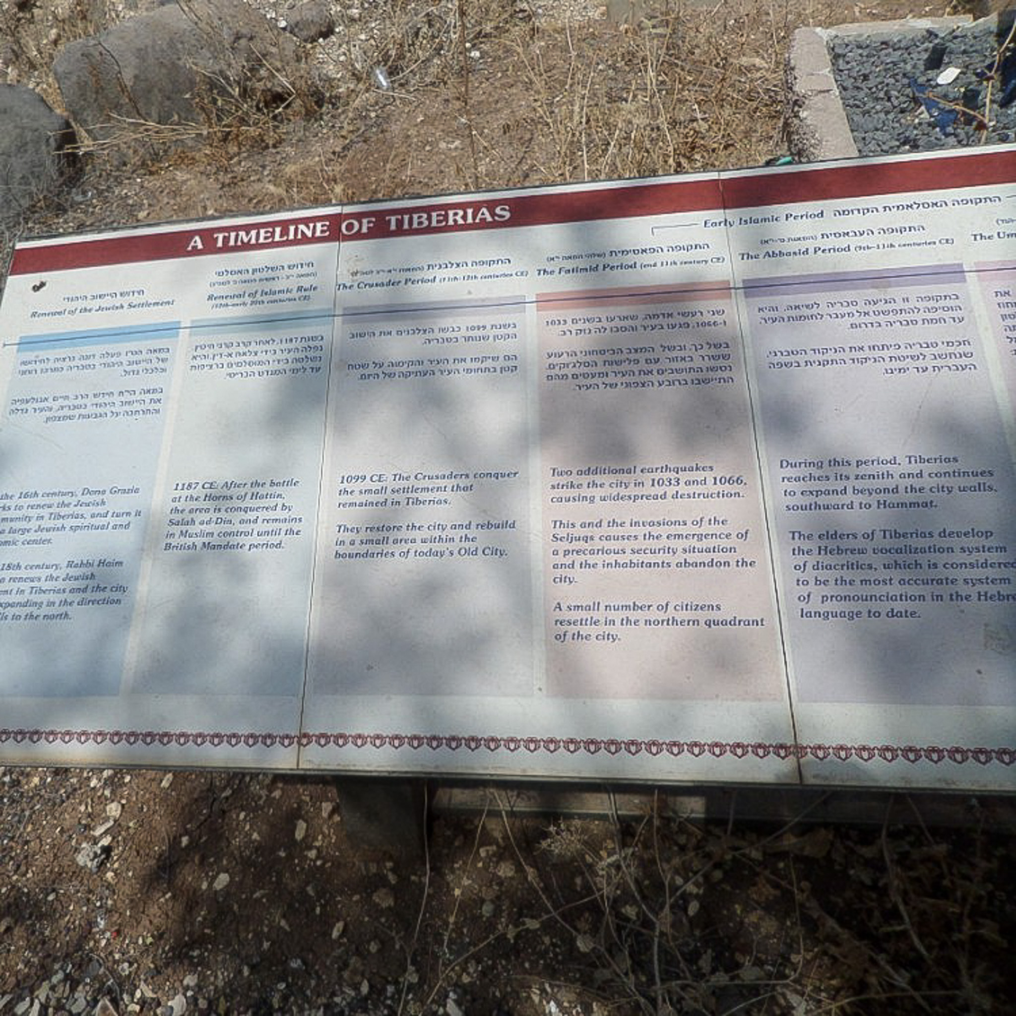 A sign details the history of Tiberias including Jewish, Crusader, Fatimid, Abbbasid, and Umayyid, Byzanntin, and Roman Periods. The sign reads from right to left and is rendered in Hebrew and English..