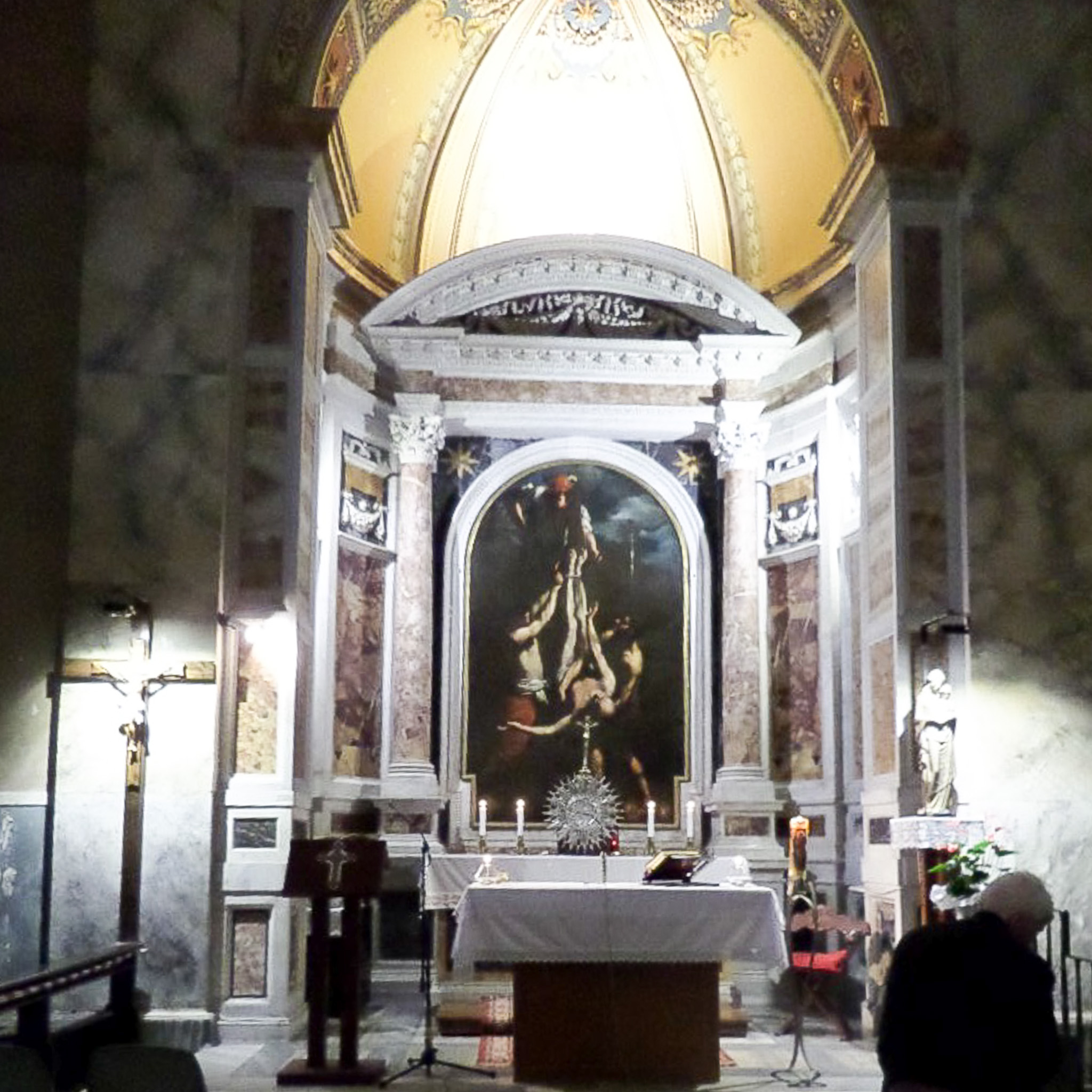 Within the Church of St. Paul at the Three Fountains in Rome, Italy hangs a copy of "The Crucifixion of St. Peter" (1604/05) by Guido Reni (1575-1642), an oil painting on canvas. The second fountain is to the right of this photograph, where black iron bars restrict access. Saint Peter was crucified upside down, at his request, because he felt unworthy to die in the same manner as Christ.