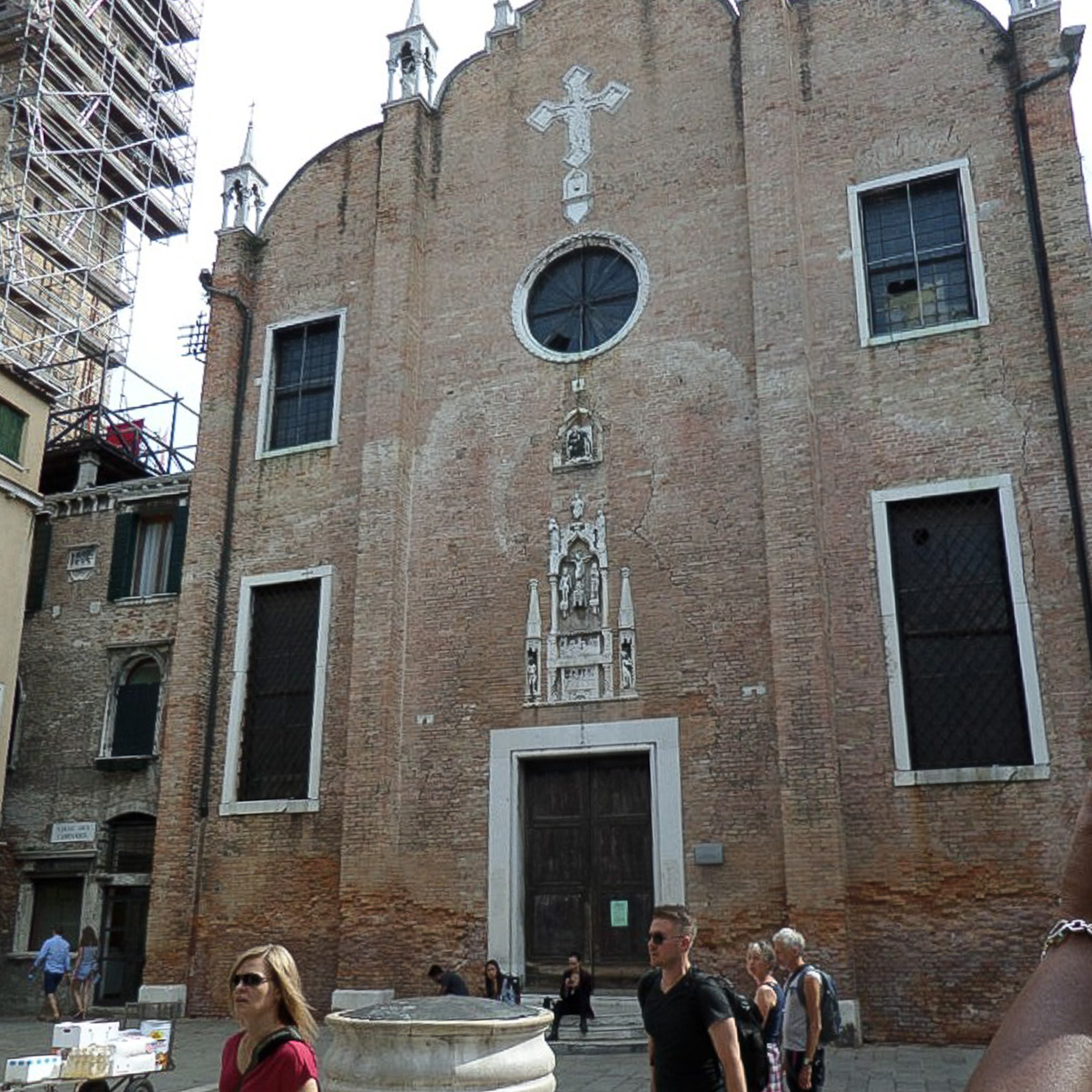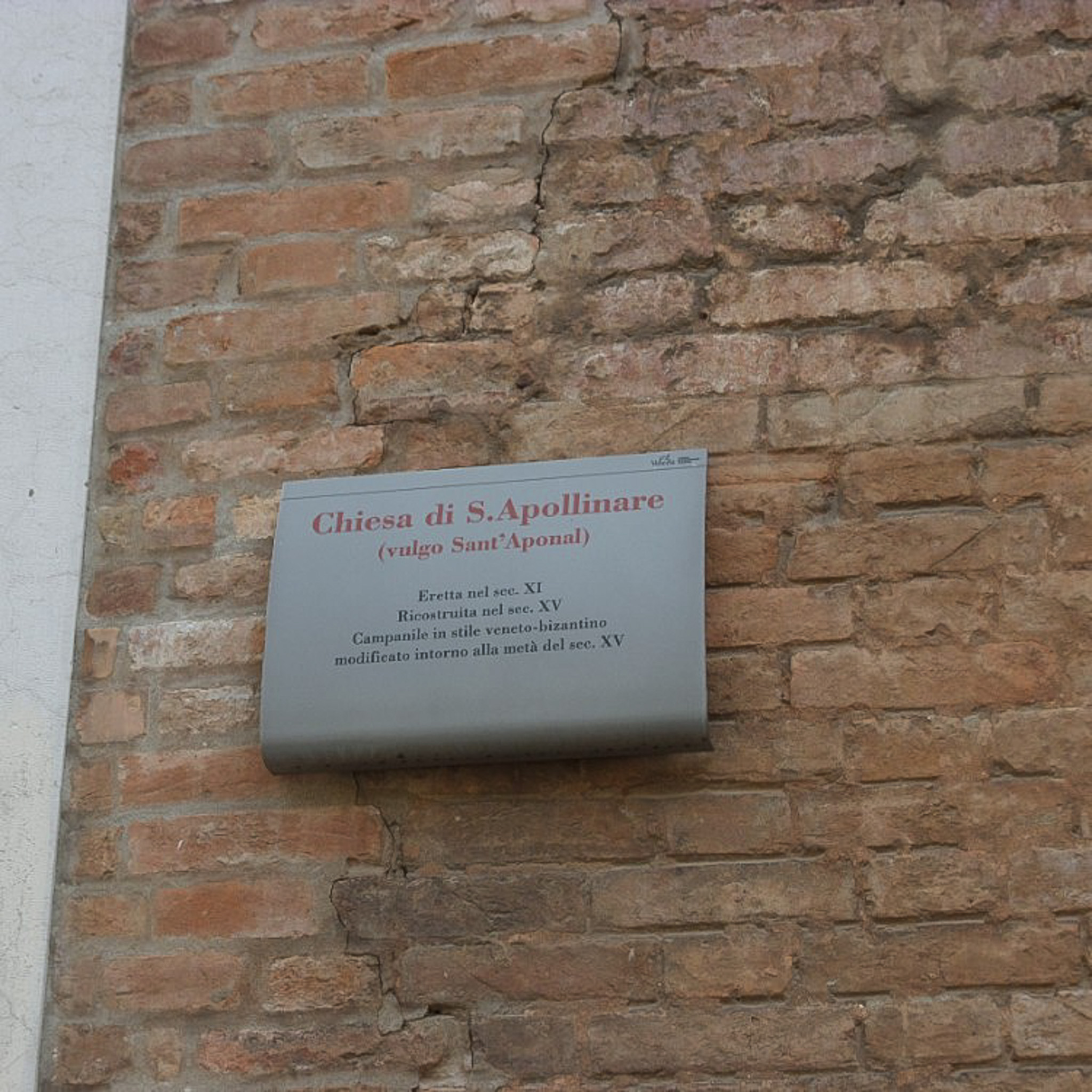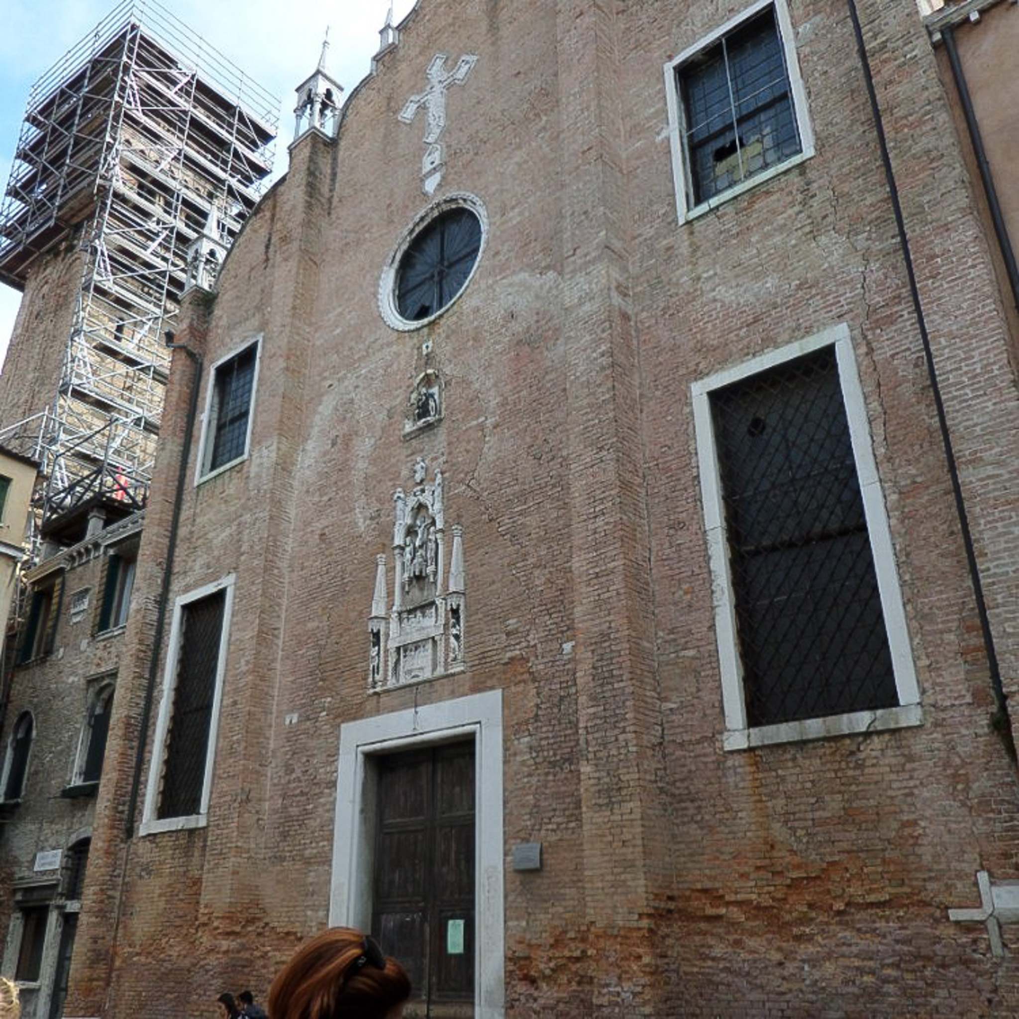 Multiple photos are associated with this record. Please click the links to view all of the items in the series. The photos are of the facade of the church of Sant'Aponal in Venice, Italy. Venice (in Italian: Venezia) is a city in northeastern Italy that is built on a group of 126 islands separated by open water and canals, linked through 472 bridges. The historical island city is home to only 51K people, but a very popular tourist destination with about 60K tourists per day. A UNESCO World Heritage Site, it is renowned for its beauty, architecture, and artwork. The San Polo district is in the heart of the main island of Venice, near the Rialto Bridge and the Rialto Market. It is the smallest district and one of the oldest in the city. The Sant'Aponal is a deconsecrated Roman Catholic church located in San Polo. It was founded in the 11th century and dedicated to Apollinaris of Ravenna. Its facade retains bits of Venetian Gothic style. Today the building is mainly an archive.