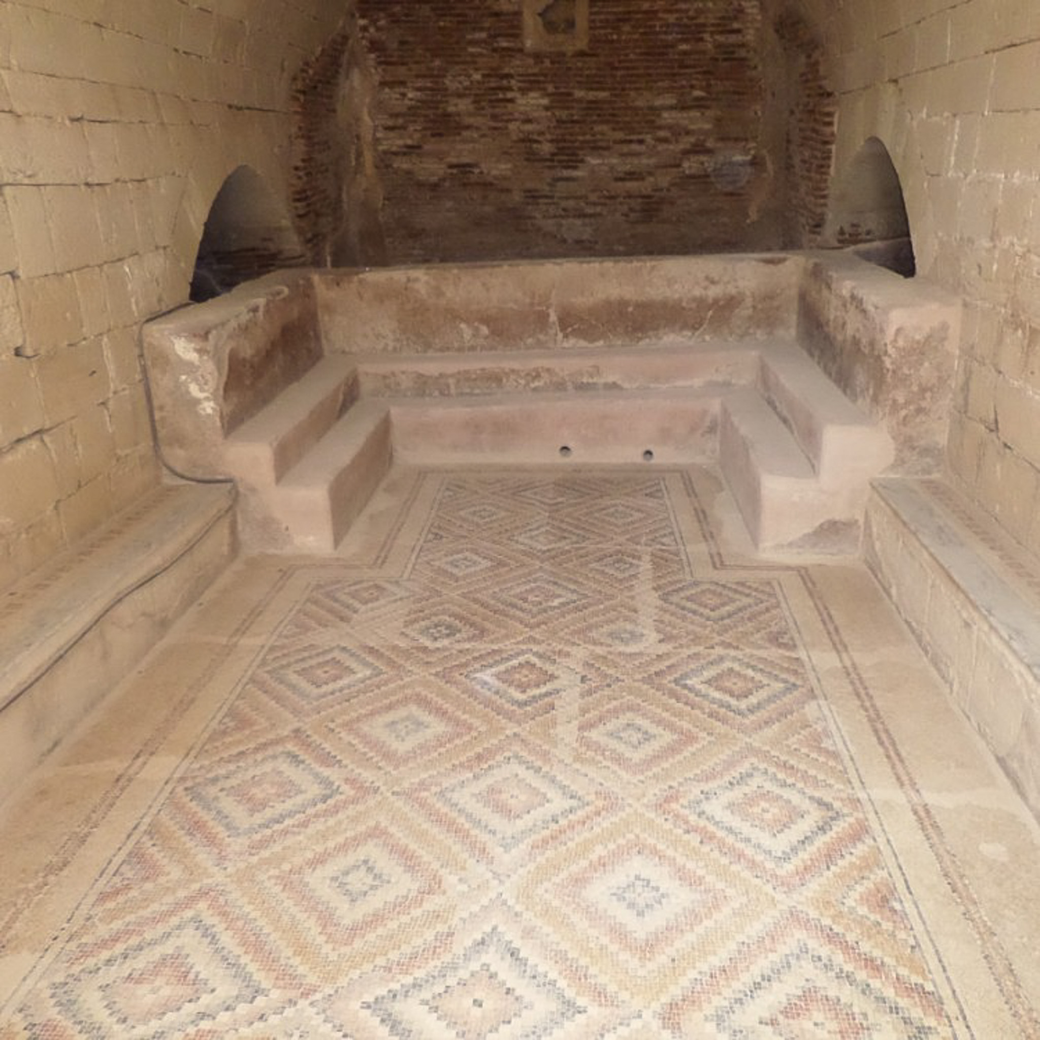 A geometric mosaic floor in blue, red, and yellow are a feature of the vaulted cold bath. There are also built-in benches.