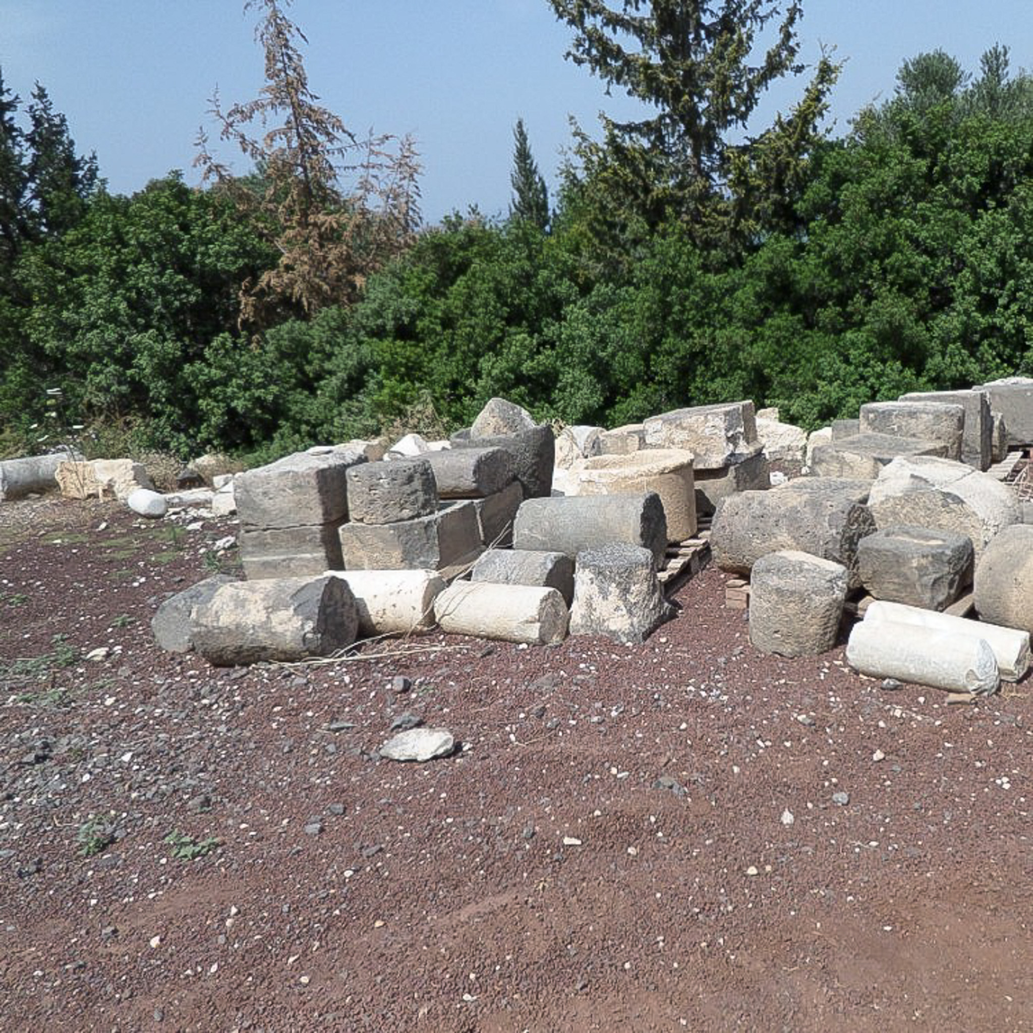 The excavations at Tiberias are intermittently active. This is a staging area with archaeological remains, including what appear to be column drums.
