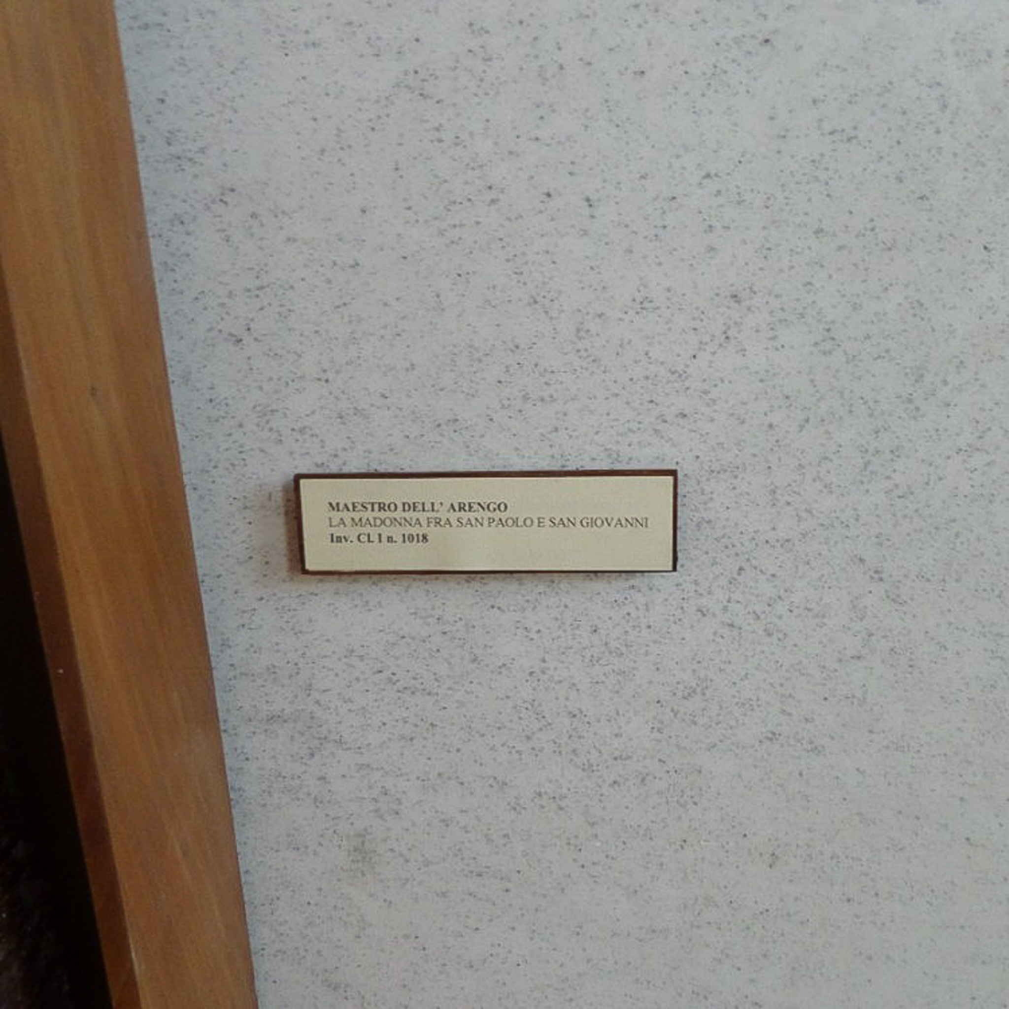 Multiple photos are associated with this record. Please click the links to view all of the items in the series. The photos were taken in the Royal Palace of Venice (in Italian: Il Palazzo Reale) in the San Marco district on the island of Venice, Italy. Venice (Venezia) is a city in northeastern Italy that is built on a group of 126 islands separated by open water and canals, linked through 472 bridges. The historical island city is home to only 51K people, but a very popular tourist destination with about 60K tourists per day. A UNESCO World Heritage Site, it is renowned for its beauty, architecture, and artwork. The landmark of St. Mark's Square (Piazza di San Marco) is the basilica dedicated to Saint Mark the Evangelist and contains his relics. The church is sited on the eastern end of the square, the former center of the Republic of Venice, and is attached to the Doge's Palace. There are other important landmarks around this square, such as the Royal Palace of Venice, which is a complex that consists of the Marciana Library, the Archaeological Museum, and the Correr Museum. These photos are of the Picture Gallery on the second floor of the Correr Museum (Museo Correr), which is located in the Procuratorie Nuove building. The museum's items originated with Teodoro Correr, a passionate collector who bequeathed his collection to the city of Venice in 1830. The painting, by a master of the Arengo, is of the Madonna and Child between Saint Paul and Saint John.