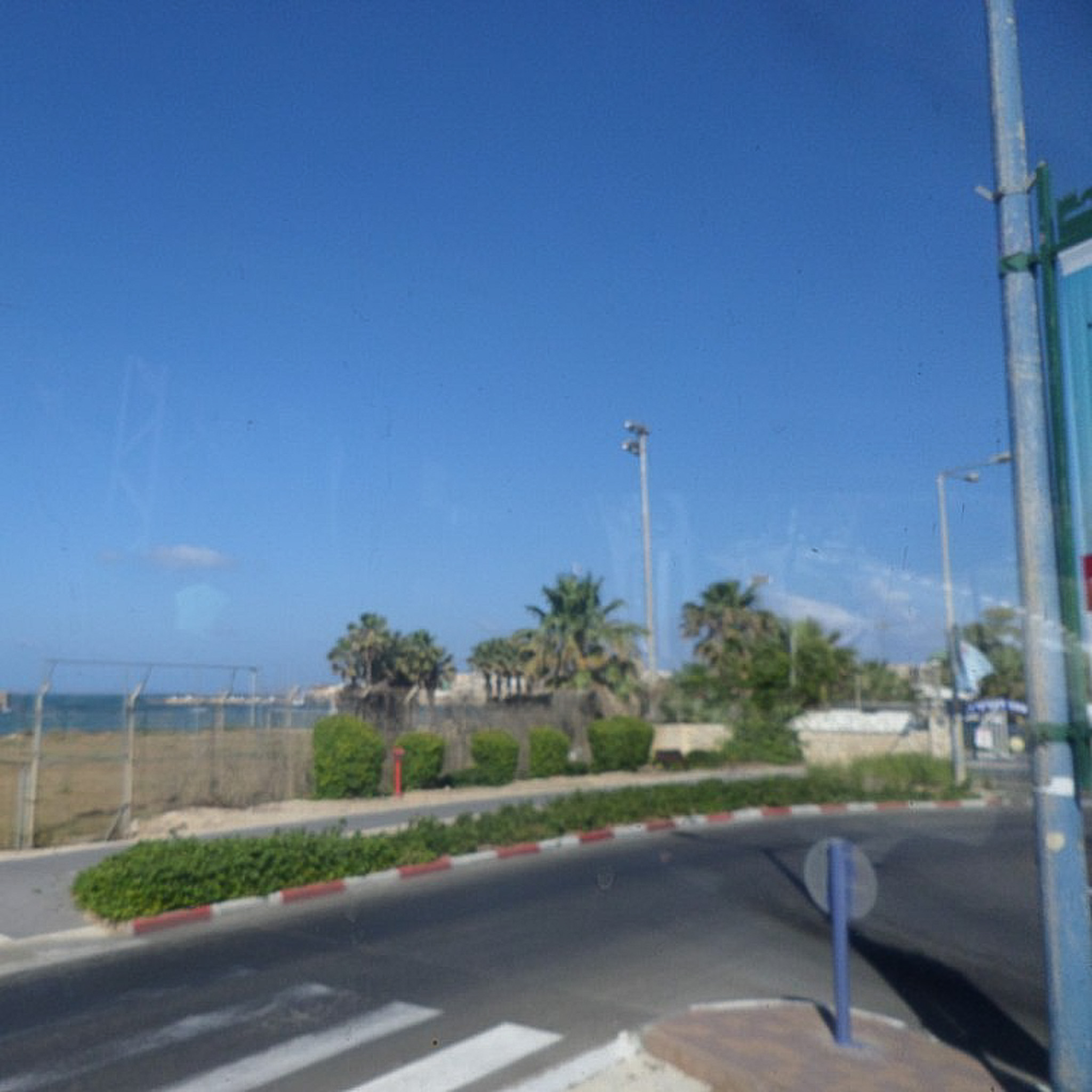 The city of Acre, also called Akko, is on the eastern coast of Israel. In the distance, behind the fence, is the promontory of the old city. This photo was taken from within a vehicle.