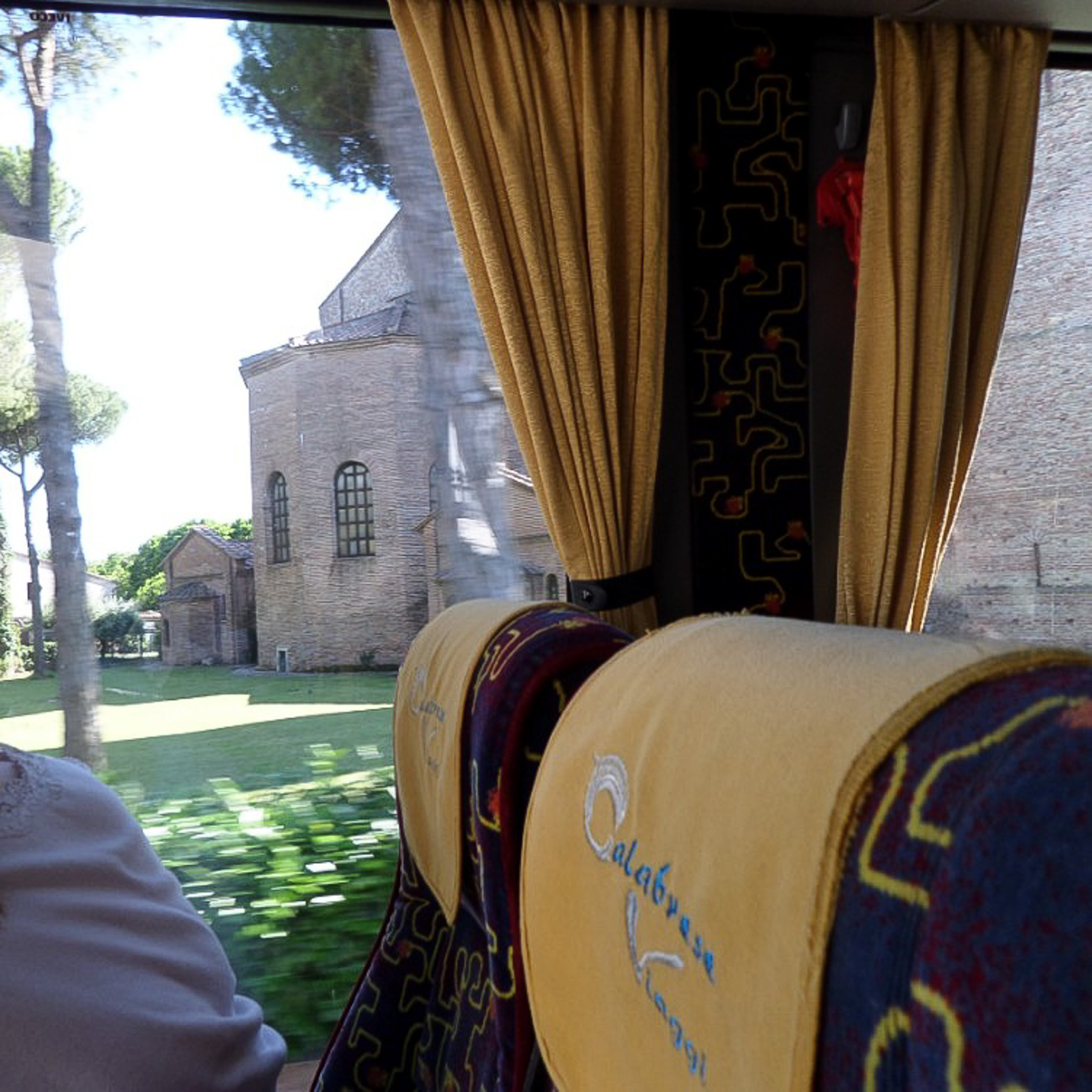 View through bus of the church when leaving the Basilica of St. Apollinare in Classe (or Basilica of Sant'Apollinare in Classe, or Saint Apollinaris in Classe), which is located in Ravenna, Italy.
