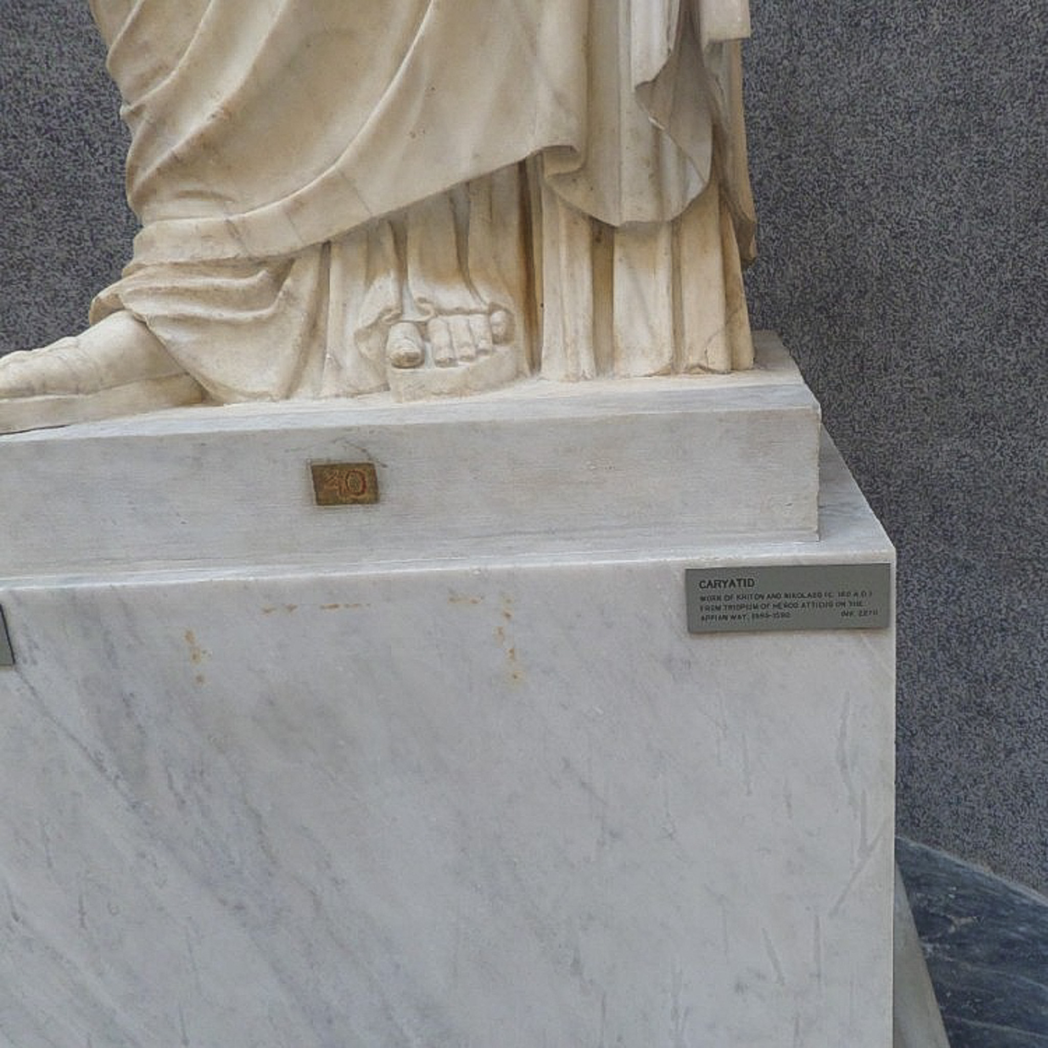 Multiple photos are associated with this record. Please click the links to view all of the items in the series. The signage and images are about a sculpture of Caryatid (a female figure used as a column to support the entablature of Greek building). This work is held in the New Wing of the Chiaramonti Museum, which is part of the Vatican Museums. The Vatican Museums are public galleries that display about 20,000 of 70K works collected by the Catholic Church and the papacy throughout the centuries. The museums were founded by Pope Julius II in the early 16th century. Only the Louvre in France receives more annual visitors than the Vatican Museums. The museums consist of 24 galleries, with the Sistine Chapel being the last room visited. The Chiaramonti is named after Pope Pius VII, who was born Barnaba Chiaramonti, and founded it in the 19th century. The New Wing was added in 1822. Another part of the Chiaramonti, the lapidary gallery, contains over 3000 tablets and stone inscriptions, but is only open to scholars on request.