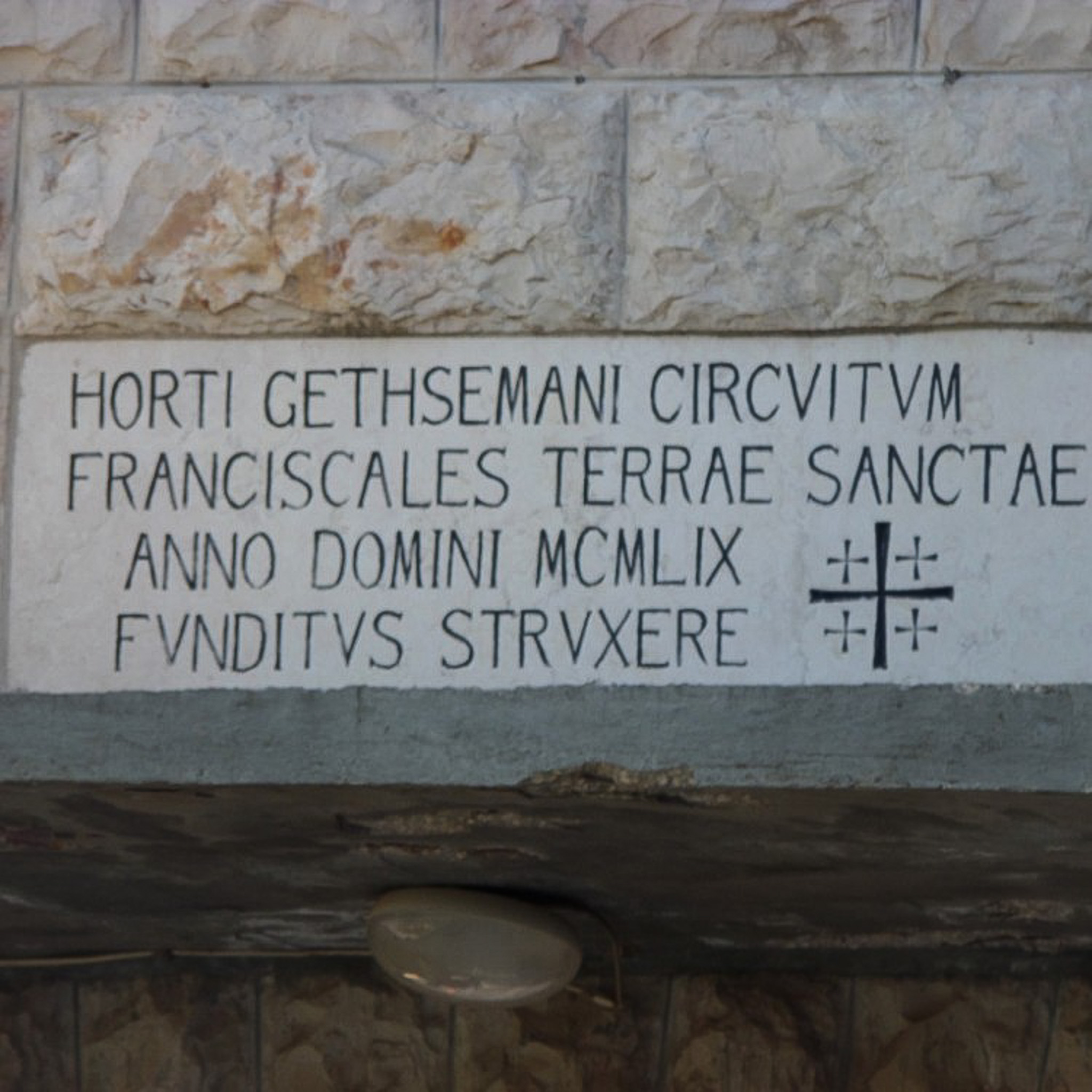 This sign, in Latin reads: Horti Gethsemani Circuitum Franciscales Terrae Sanctae Anno Domini MCMLIX Funditus Struxere. It roughly translates to: The Frsncican Circuit of the Garden of Gethsemane of the Holy Land was established in 1999.
