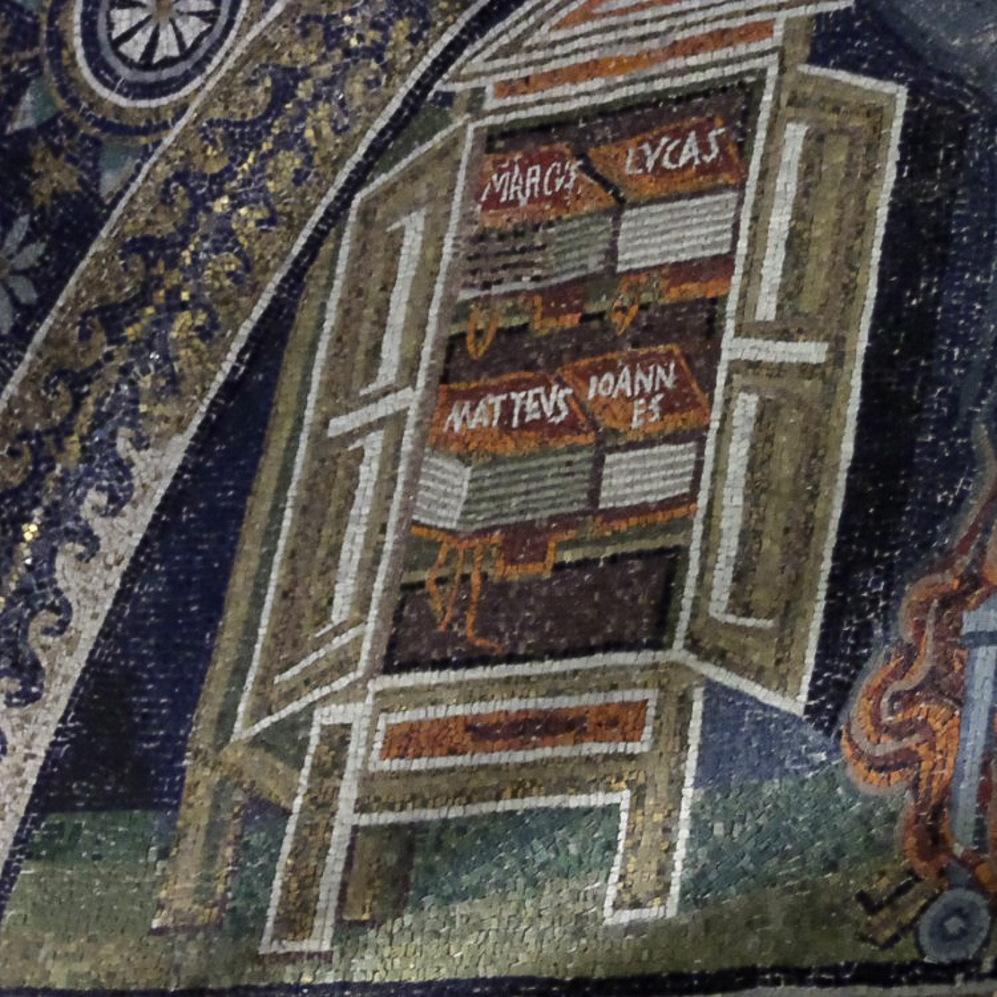 A portion of the southern lunette mosaic in the Mausoleo di Galla Placidia (Galla Placidia Mausoleum; Mausoleum of Galla Placidia) in Ravenna, Italy. The photograph is a detail image of the cupboard of the four gospels.