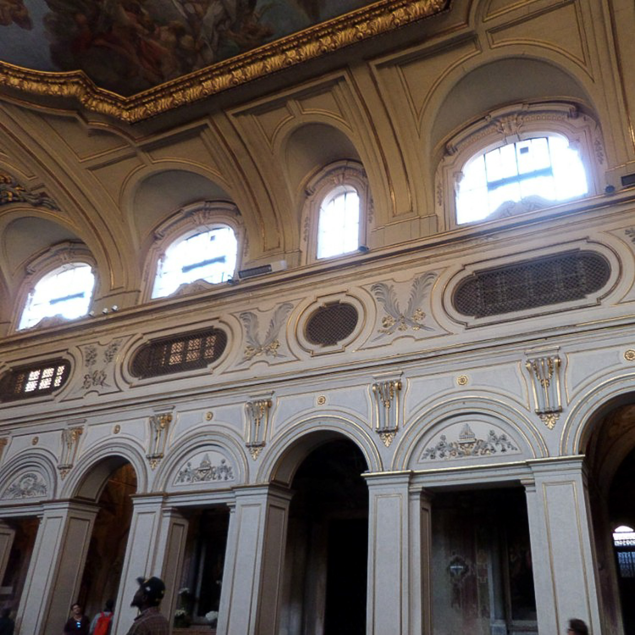 Located in Piazza di Santa Cecilia, the Basilica of Saint Cecilia in Trastevere (Basilica di Santa Cecilia in Trastevere) was built on the site of the house of a Roman martyr and her husband Valerian. Saint Cecilia was found guilty of trying to convert her husband and brother to Christianity and was martyred in 230 CE. She survived three days in a hot, steamy calidarium without suffocating, so a swordsman tried to behead her. He struck her three times, unsuccessfully, then dropped the sword in fear and ran away. She died three days later from her wounds. Saint Gregory the Great started construction of the basilica in the 6th century. Saint Cecilia's body was discovered intact in 820 in the catacombs of San Callisto after, legend says, a saint revealed its location to Pope Paschal I in a dream, and he ordered it to be transferred to the renovated church. In the 12th and 13th centuries the cloister, atrium, and bell tower were added to the basilica. Saint Cecilia's body was exhumed in 1599 during another renovation and was found still intact, wrapped in her white garment, with dried blood on her neck. A statue of this body, posed exactly how she was found, was sculpted by Stefano Maderno in 1600 and appears under the current altar, with her actual relics stored below. Today the basilica is under the care of the Benedictine nuns who live in the attached monastery. The site hosts one of the best archaeological sites in Rome. The photograph shows the central nave of the church. It was partly restored in the 19th century, with the columns enclosed in pillars in order to strengthen them and support the weight of the 18th century ceiling vault. According to a Churches of Rome website: "The unfortunate solution was to box the columns into thicker pillars, trabeate every other arch and infill its tympanum."