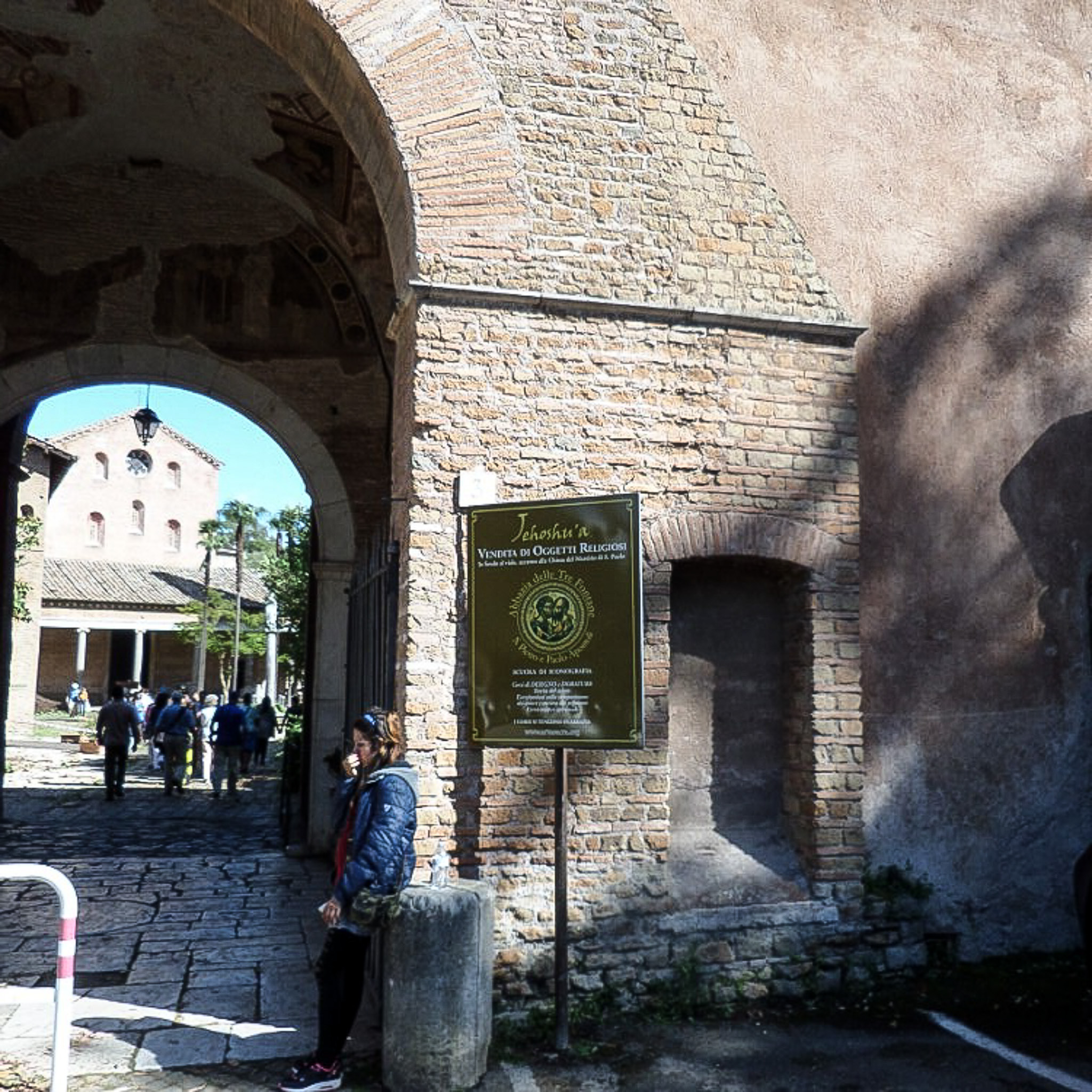 A sign to the right of the Arch of Charlemagne within the Abbey of the Three Fountains (Rome, Italy). The sign says "Vendita di oggetti religiosi," which means "Sale of religious objects." It seems to be advertising a special sale. The Arch of Charlemagne is the entrance to the actual abbey complex of the Abbazia delle Tre Fontane (Abbey of the Three Fountains) in Rome, Italy. The complex is four miles outside Rome, run by Cistercian monks belonging to the Trappist order. It contains three churches, of which the Church of Saint Paul at the Three Fountains (Church of the Martyrdom of Saint Paul; San Paolo alle Tre Fontane; Church of St. Paul the Apostle) is most sacred. This church was built on the site where Saint Paul was beheaded on Emperor Nero's order. As a Roman citizen, Saint Paul could not be executed within the city. The other two churches in the complex are the earliest one: the Benedictine Church of Saint Vincent and Saint Anastasius, built in 626; and the 16th century Roman Catholic Church of Saint Maria Scala Coeli, where Saint Paul stopped to pray for the last time before he was beheaded. The legend is that Paul's head bounced three times and fountains sprang up at each spot; hence, the title of "Three Fountains." Actually, fountains already existed at the site when Paul was beheaded. The Arch of Charlemagne was built in the 13th century and is named after Charlemagne because he endowed the Abbey. On the ceiling of Charlemagne's Arch are fragments of frescoes, including the attributes of the four Evangelists: the Angel for Saint Matthew, the Lion for Saint Mark, the Ox for Saint Luke and the Eagle for Saint John. Through the arch, the Church of Saint Vincent and Anastasius is visible.