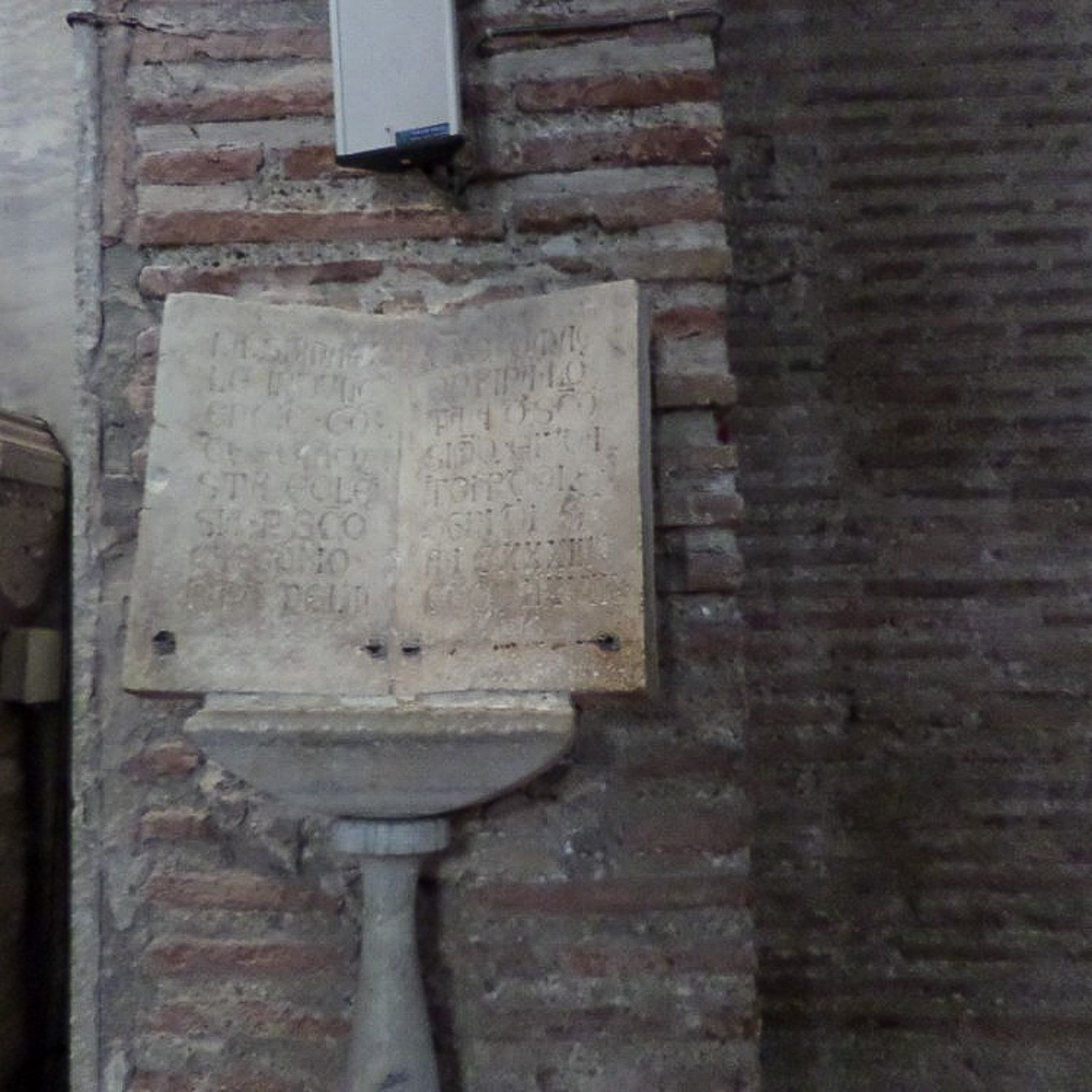A wall decoration in the nave of the Basilica of St. Apollinare in Classe (or Basilica of Sant'Apollinare in Classe, or Saint Apollinaris in Classe), which is located in Ravenna, Italy. It looks like an opened book on a pedestral, with Latin words and Roman numerals chiseled onto the pages.